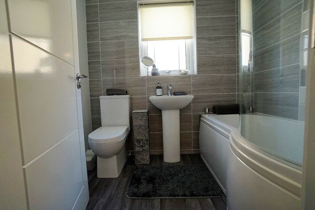 Modern white bathroom suite comprising of low flush WC and pedestal wash hand basin. Curved bath with overhead shower. Fully tiled walls. Heated towel radiator. Tiled floor.