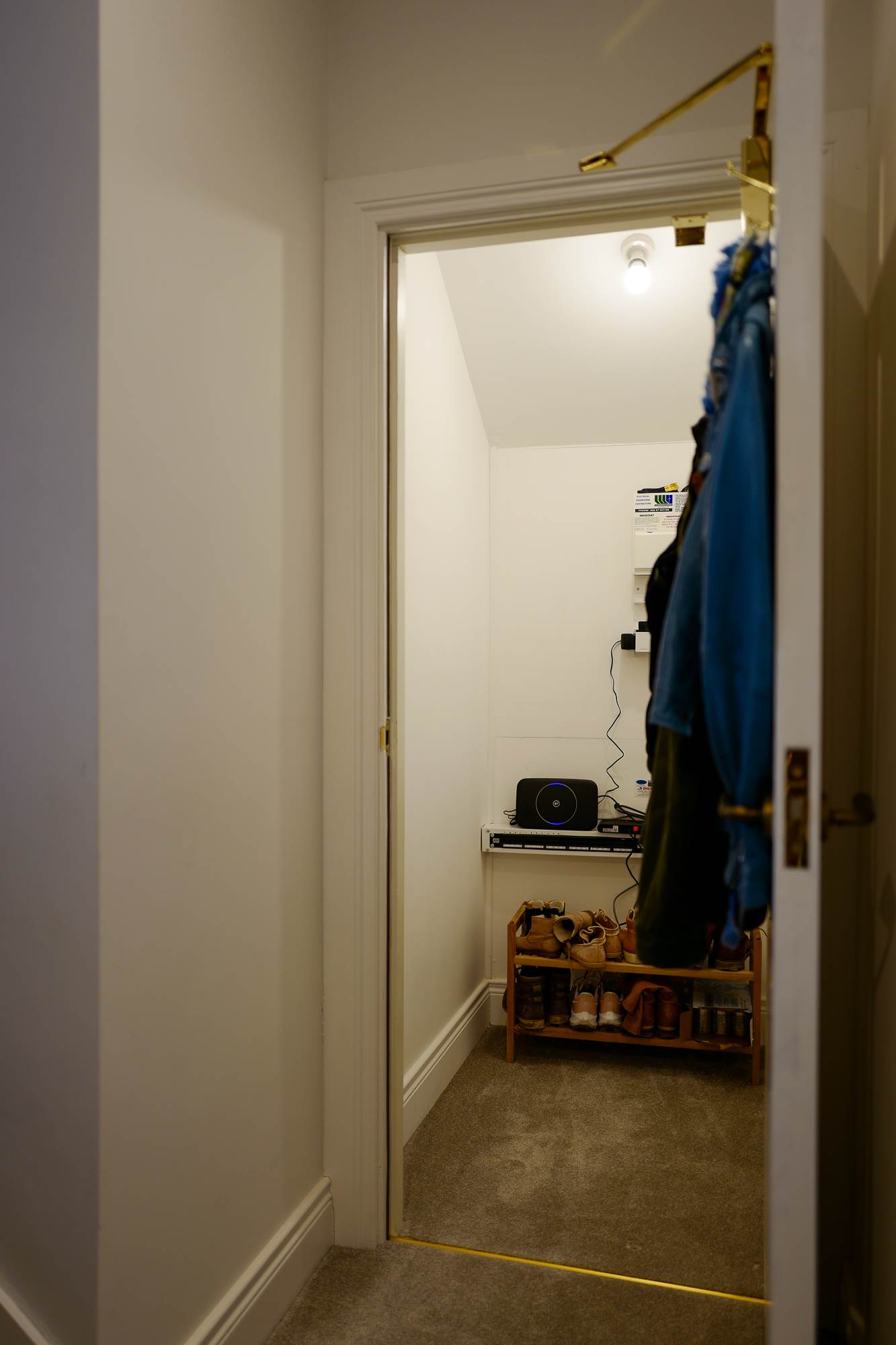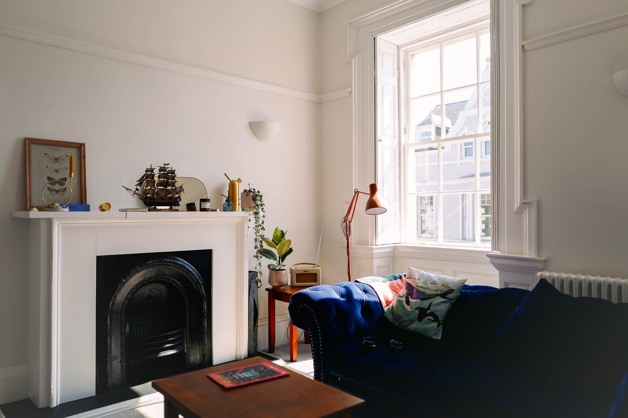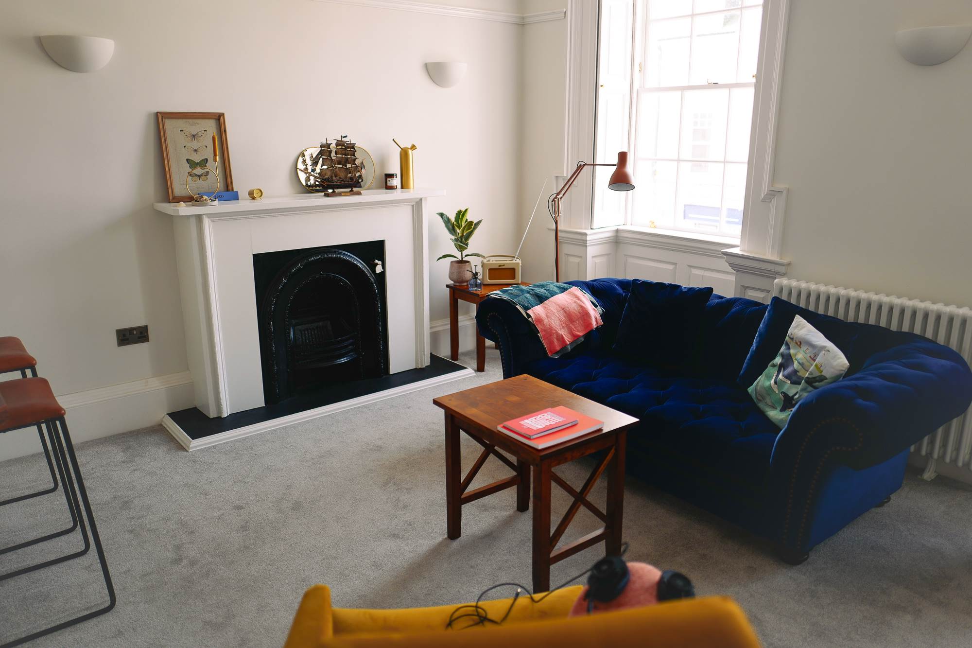 Living space with fire surround and cast iron inset. Wall light wiring. Carpeted. Ceiling rose.