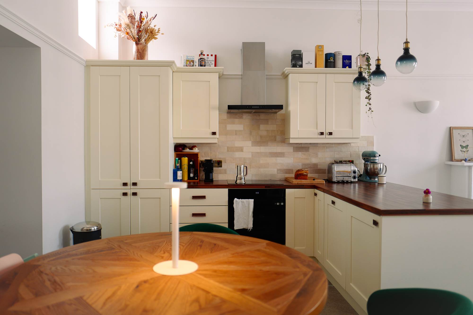Fitted kitchen with integrated appliances including hob, cooker, fridge, freezer, washing machine/tumble dryer and dishwasher. Stainless steel sink unit. Partly tiled walls. Tiled floor. Recessed lighting. Corniced ceiling. Intercom system. Gas boiler.