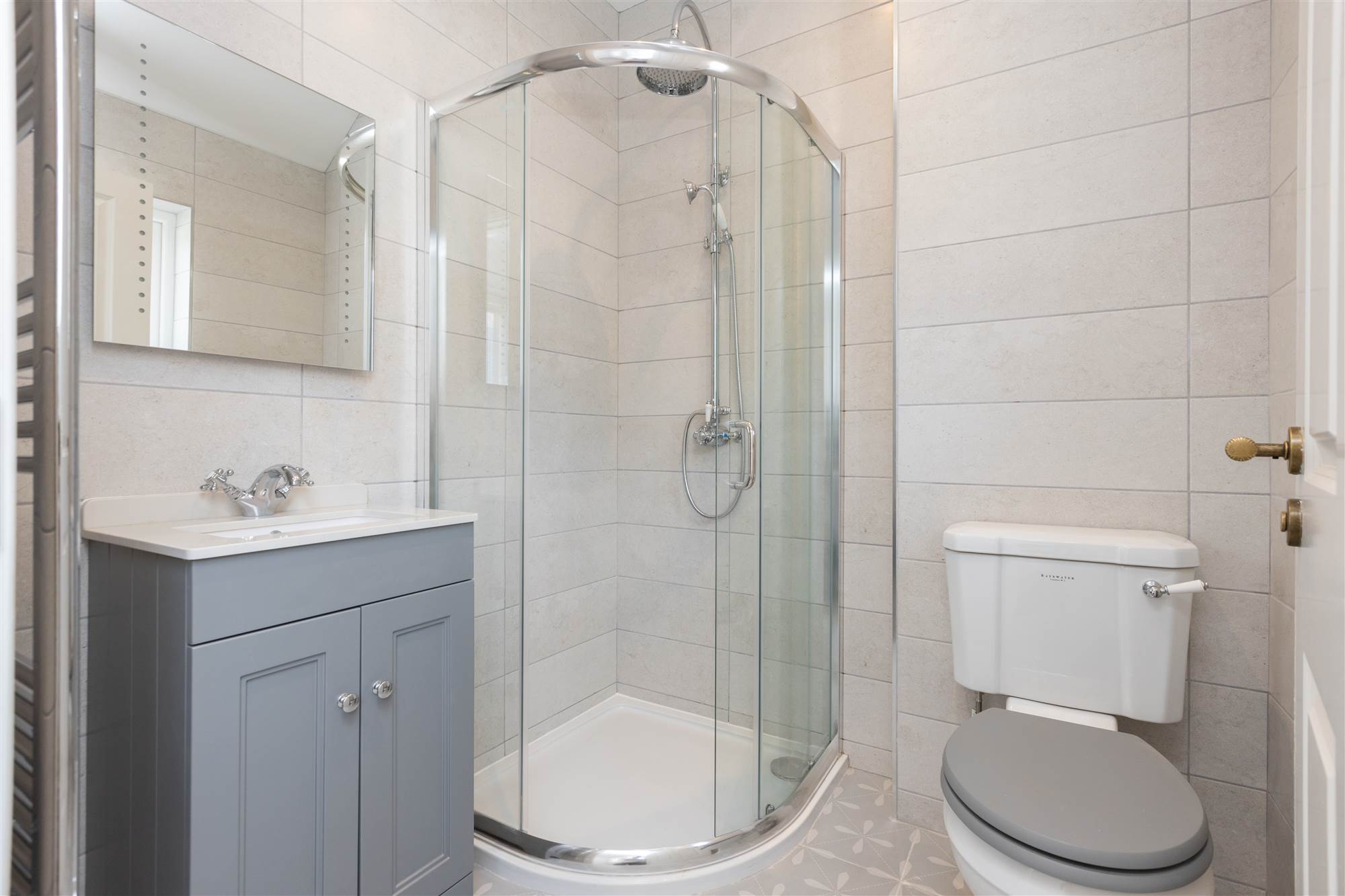 White suite comprising of low flush WC, wash hand basin with vanity unit below and illuminated wall mirror above and corner shower with period style shower fitments. Chrome heated towel radiator. Fully tiled walls. Tiled floor. Recessed lighting.