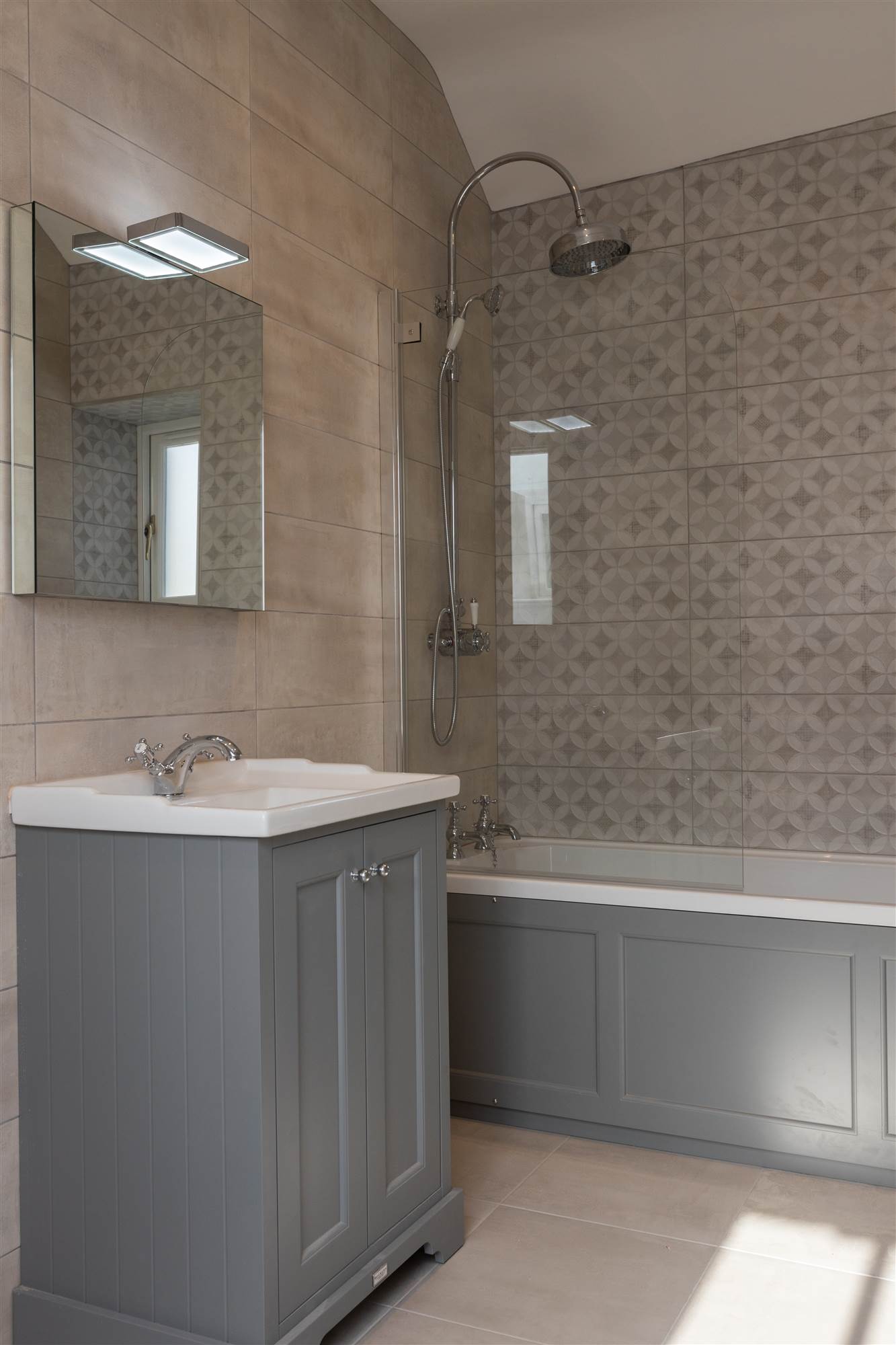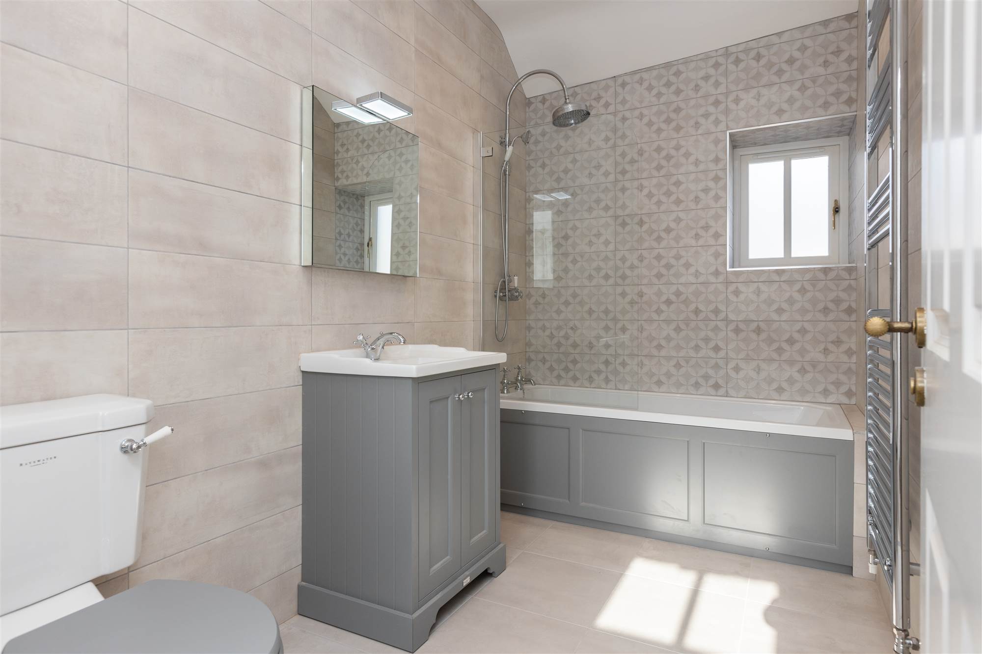 White suite comprising of low flush WC, wash hand basin with vanity unit below, panelled bath with period style taps and overhead shower fitment. Chrome heated towel radiator. Fully tiled walls. Tiled floor. Recessed lighting.