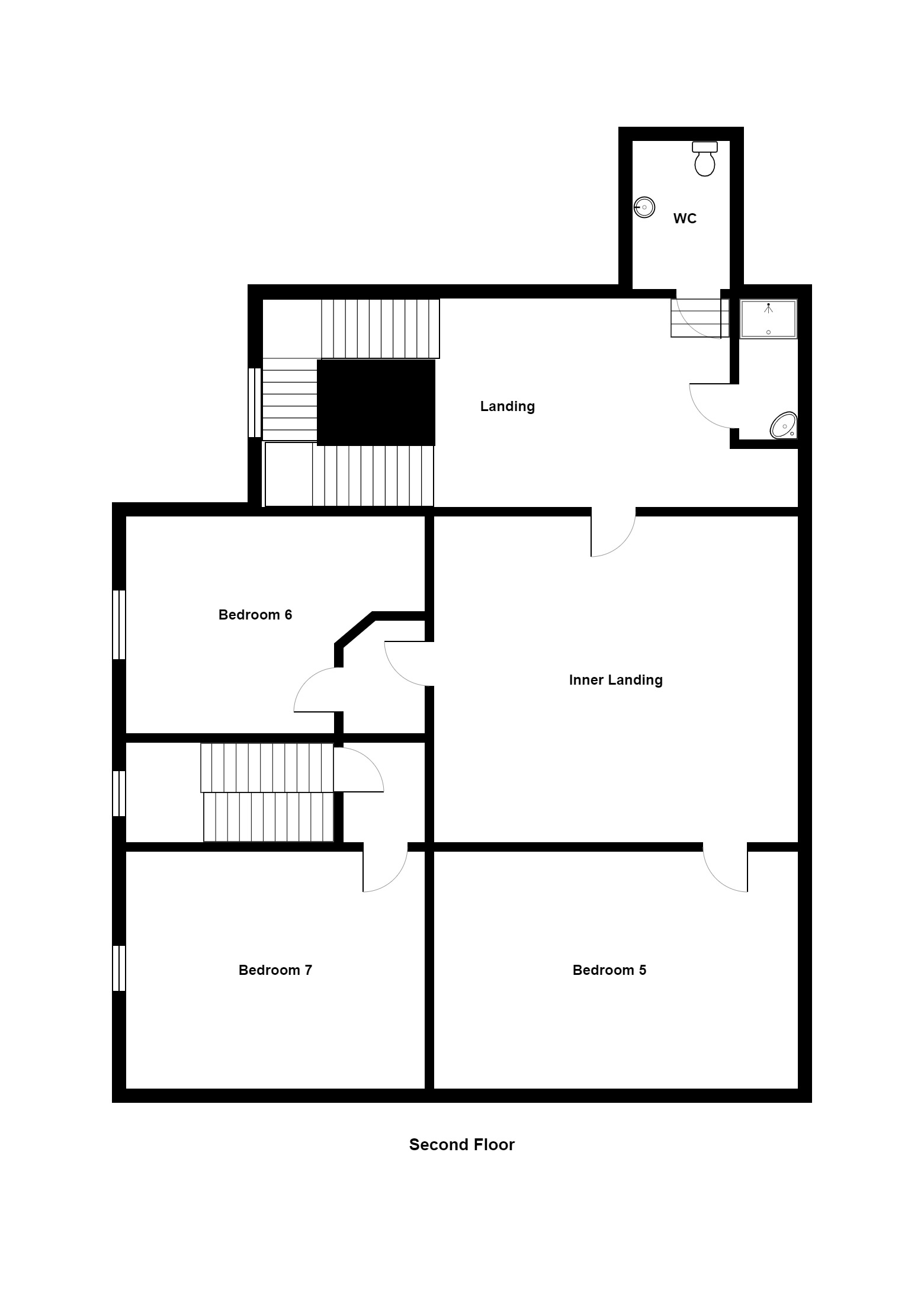 On the second floor there are 3 further bedrooms, plentiful landing space, a separate wc and shower room and secondary access down the back staircase.