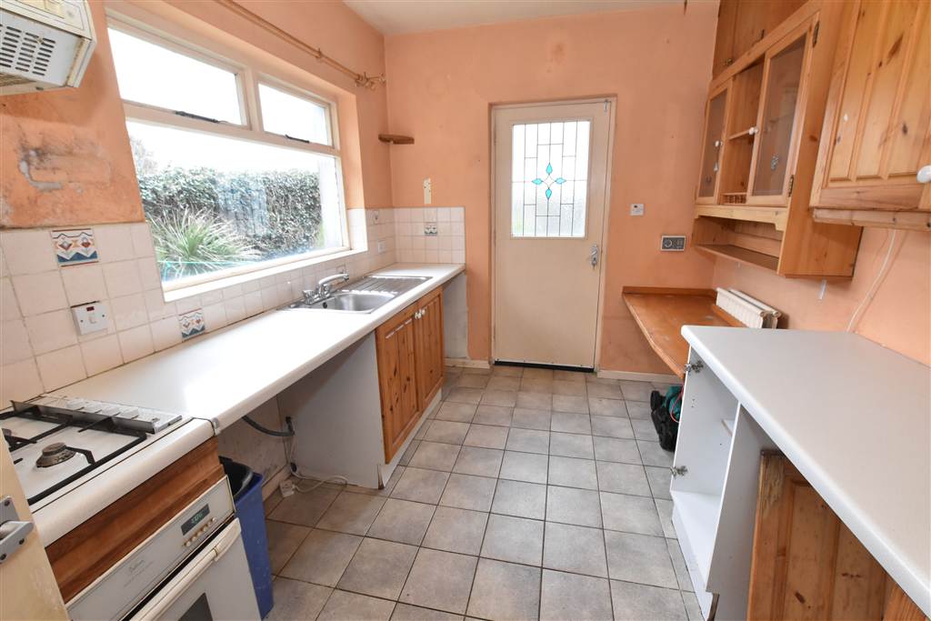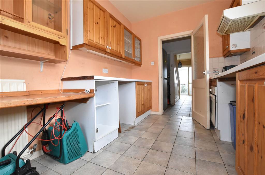 Galley style kitchen with a range of high and low level fitted cabinets. There is a stainless steel sink with mixer tap and drainer, integrated oven and gas hob, tiled floor and partially tiled walls. The door to the back garden is decoratively glazed and is just after the breakfast bar area.