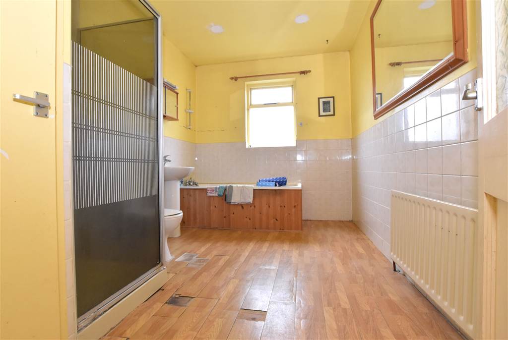 Large sized bathroom with partially tiled walls. shower in cubicle, bath with wooden panelling, wash hand basin on pedestal, hot press and window to the exterior.