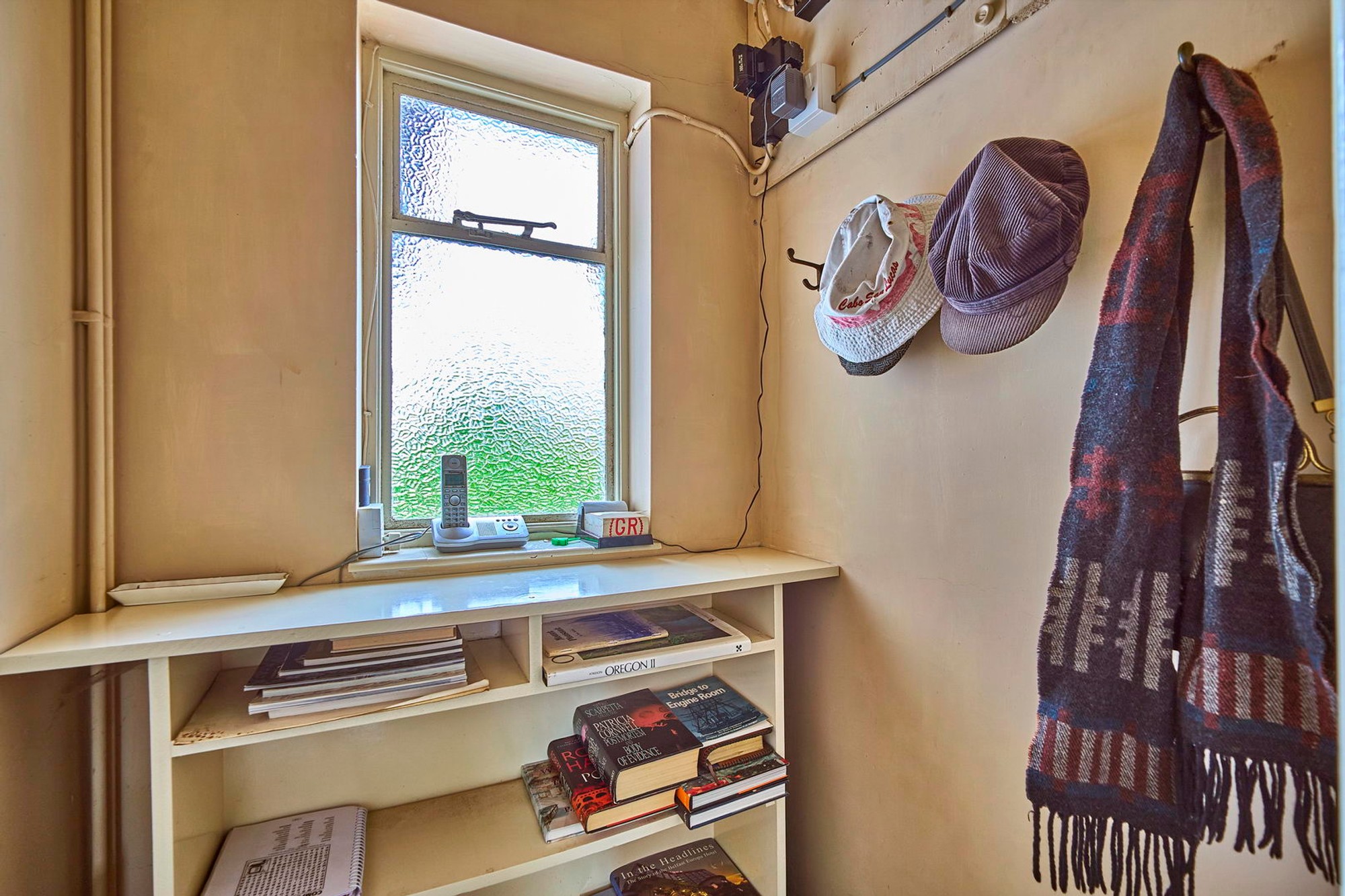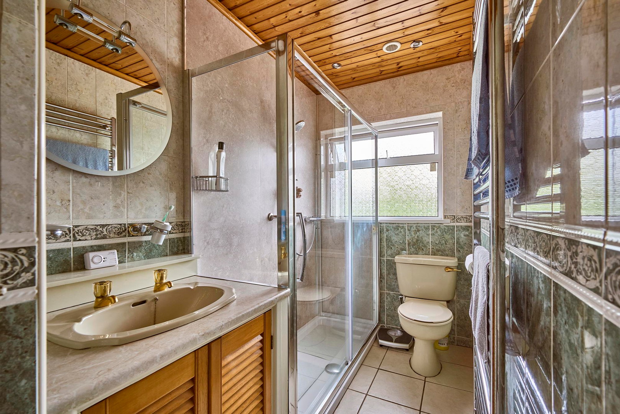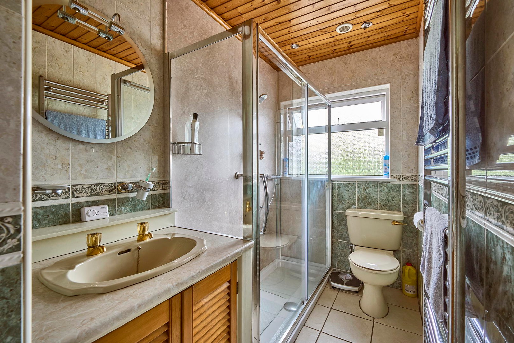 Vanitory basin with storage under, low flush wc, panelled shower cubicle, fully tiled walls, cupboard housing gas fired boiler.