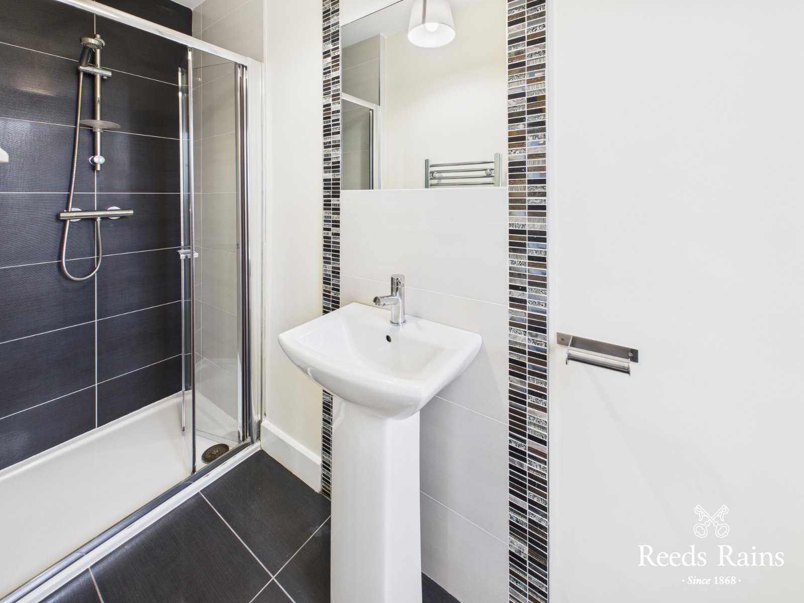 Contemporary three piece white suite including tiled enclosed shower cubicle with thermostatically controlled shower unit, pedestal wash hand basin with mixer tap and Dual flush WC, extractor fan, part tiled walls, ceramic tiled floor, heated towel rail.