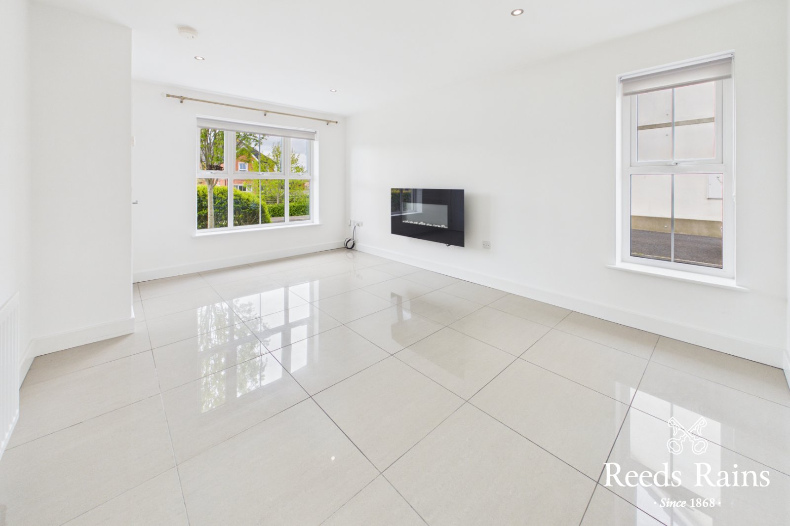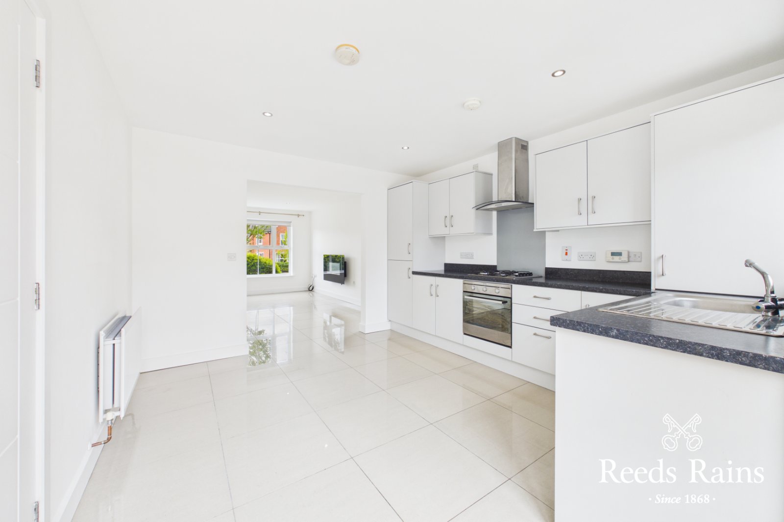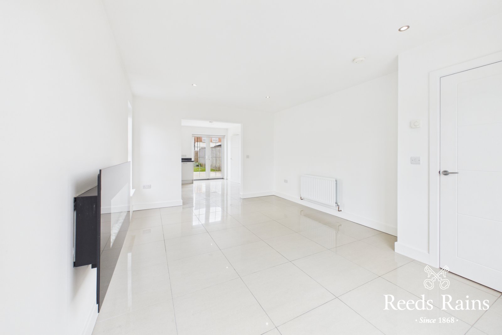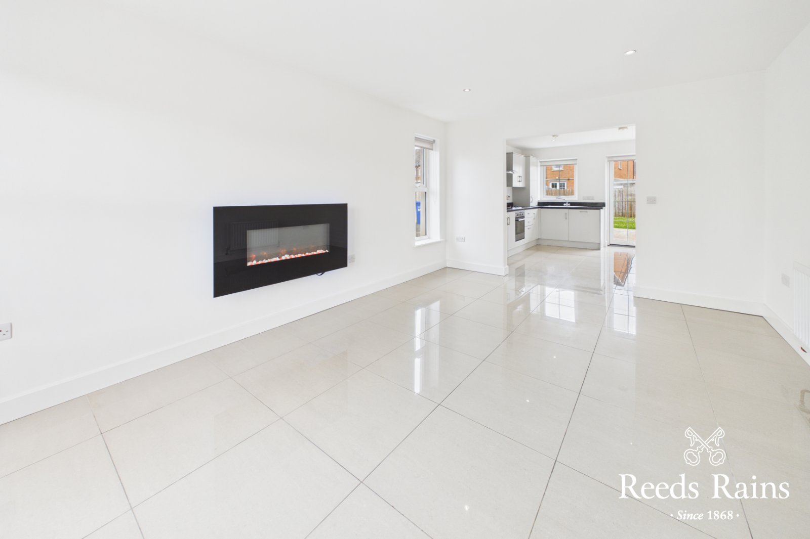 Recessed spotlights, ceramic tiled floor, open plan to kitchen.