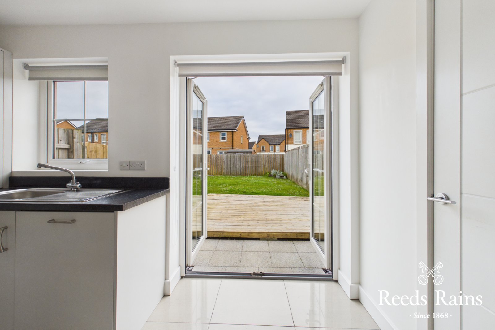 Single drainer stainless steel sink unit with mixer taps, excellent range of high and low level units with laminated work surfaces, built in oven and 4 ring gas hob, glass splashback, stainless steel chimney extractor fan, integrated fridge freezer, integrated dishwasher, ceramic tiled floor, recessed spotlights, casual dining area, uPVC double glazed French doors to rear garden.