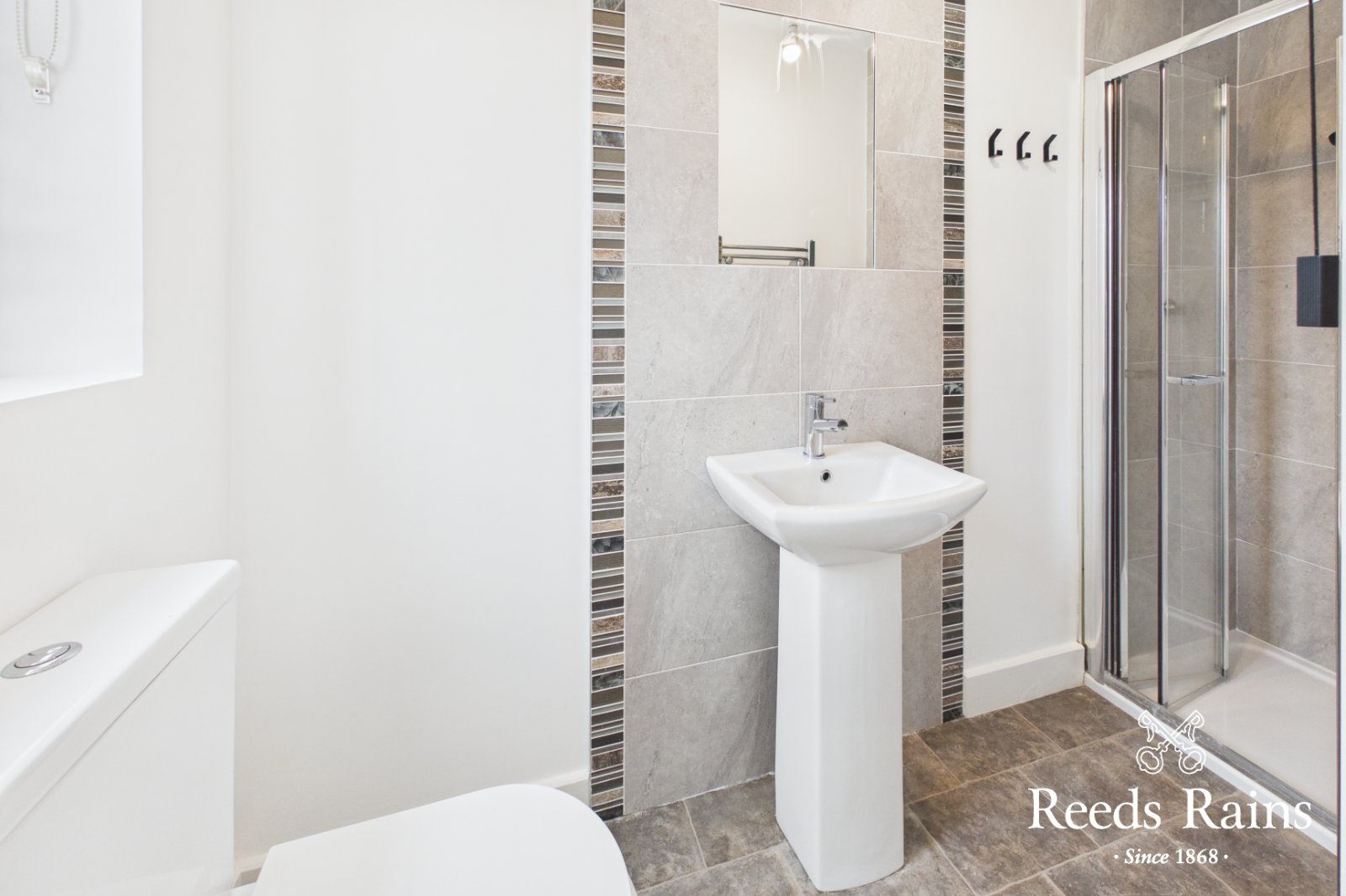 Modern white suite comprising: Fully built in shower cubicle with thermostatically controlled shower, dual flush WC, pedestal wash hand basin, ceramic tiled floor, part tiled walls, stainless steel heated towel rail.