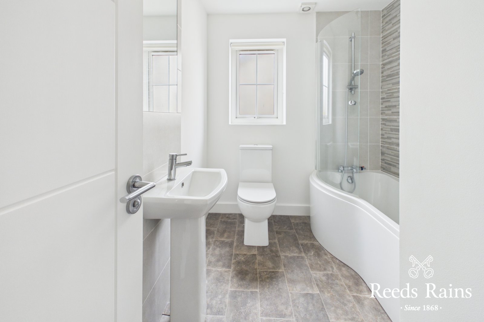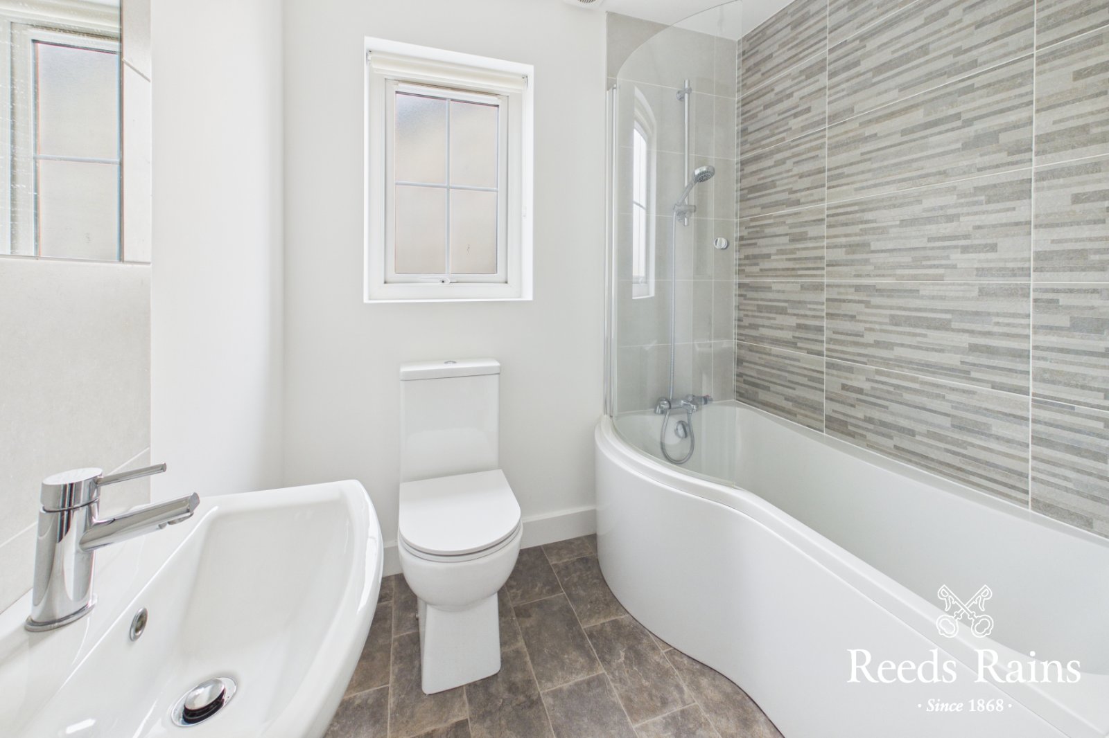 Upstairs, there are three well-proportioned bedrooms, including a master with en-suite shower room, and a family bathroom with white suite.