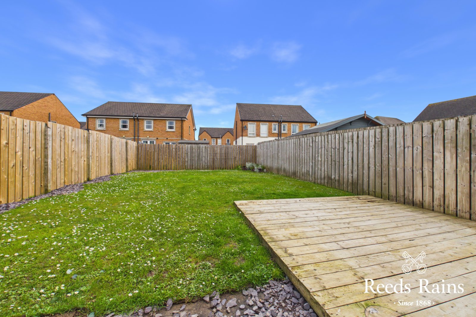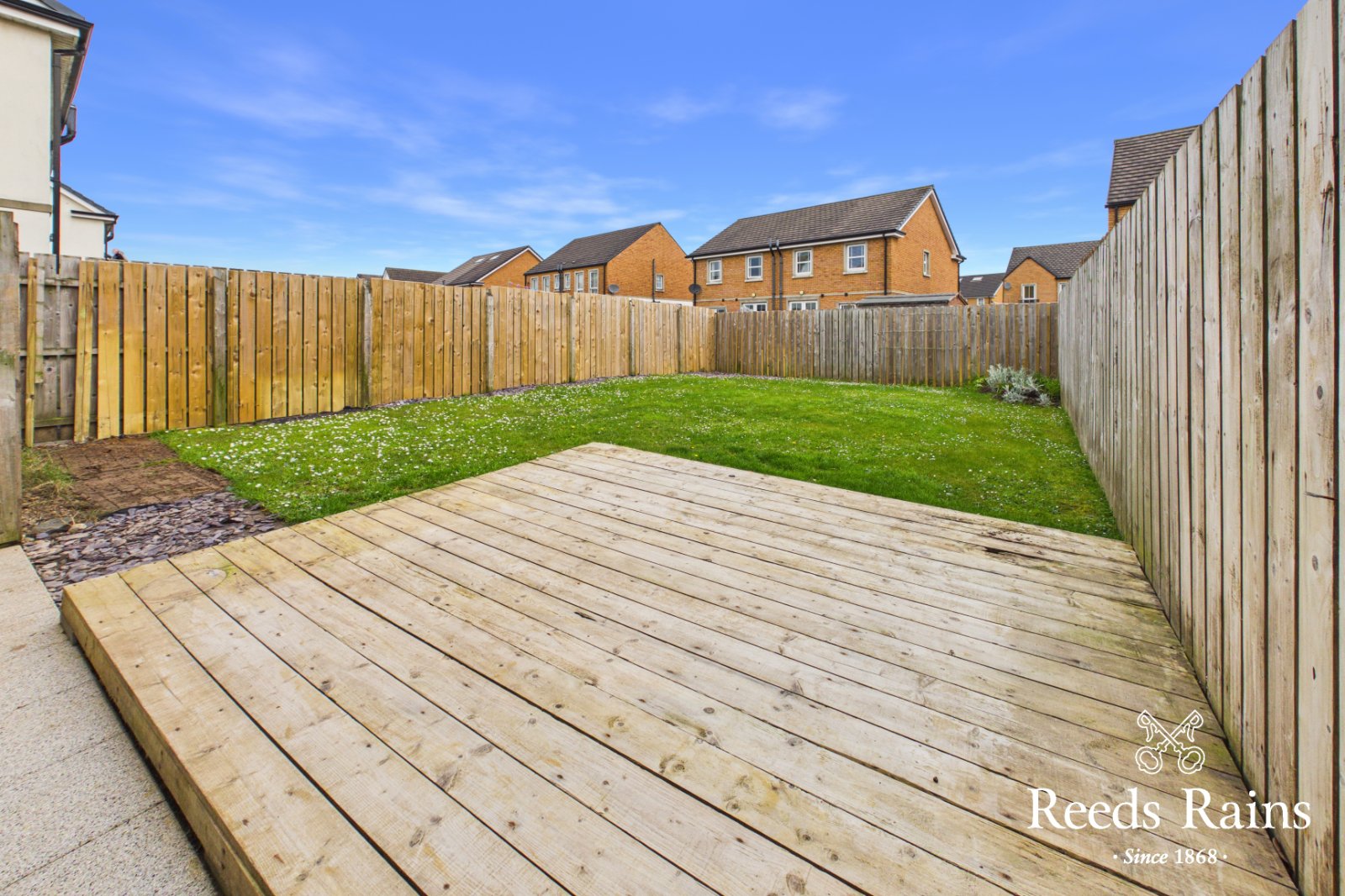 Enclosed garden to rear in lawns flowerbeds and shrubs, decking and paved walkways. External power points.