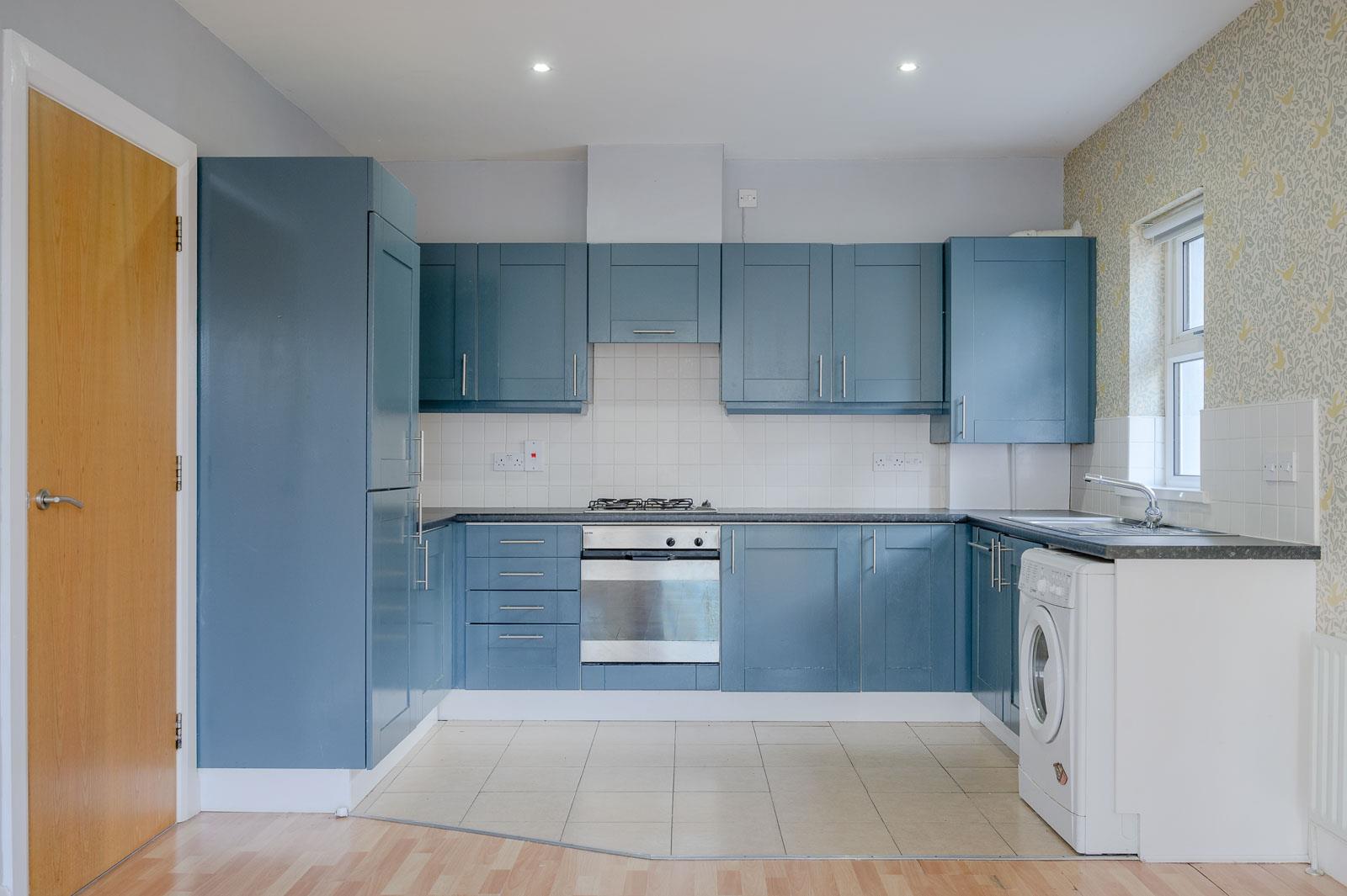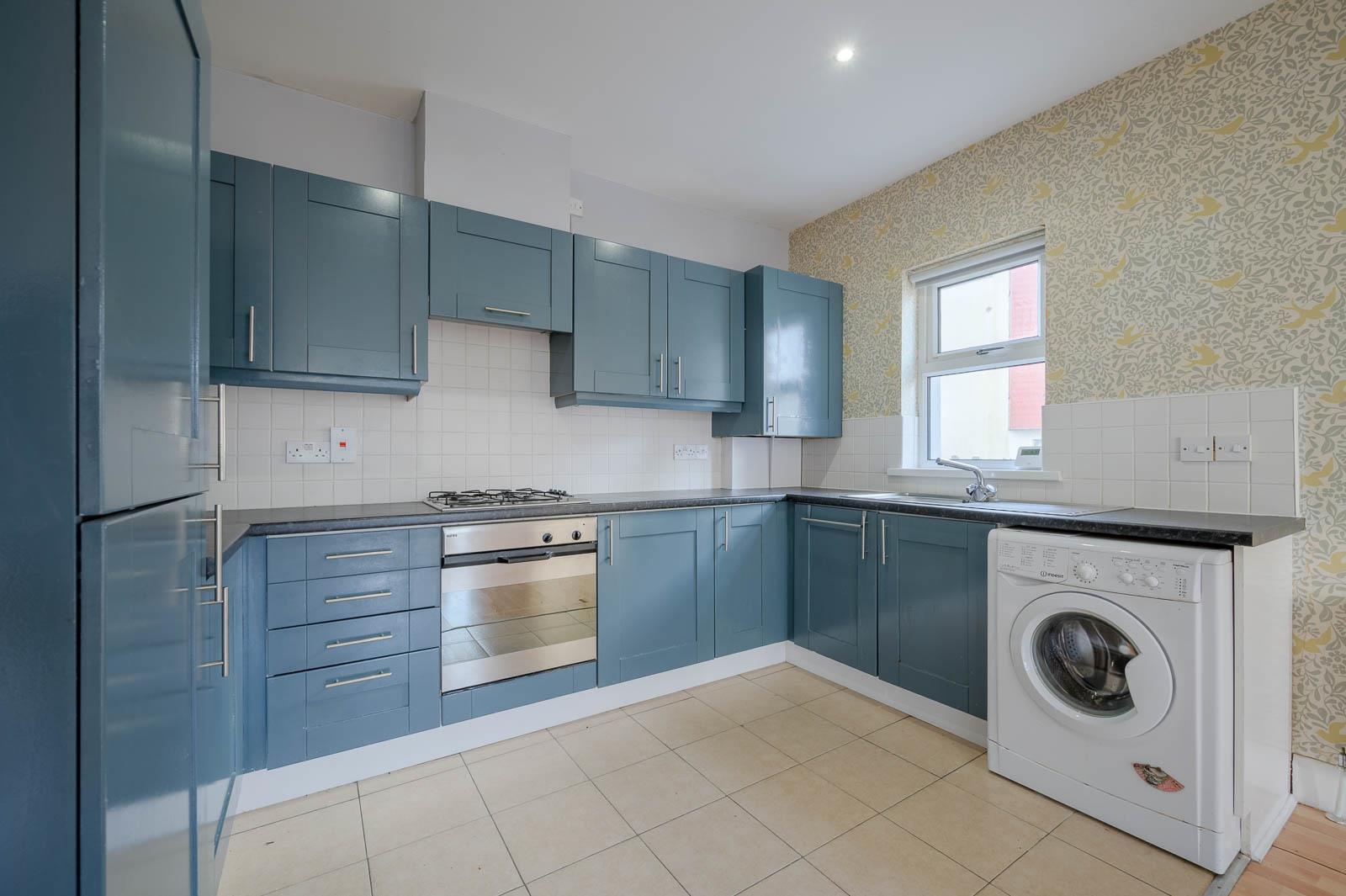 With range of high and low level Shaker style units, granite effect work surfaces, single bowl single drainer stainless steel sink unit with mixer tap, integrated four ring gas hob, tiled splashback, extractor fan above, integrated oven, plumbed for washing machine, integrated fridge freezer, part tiled floor, part tiled walls, gas fired boiler.