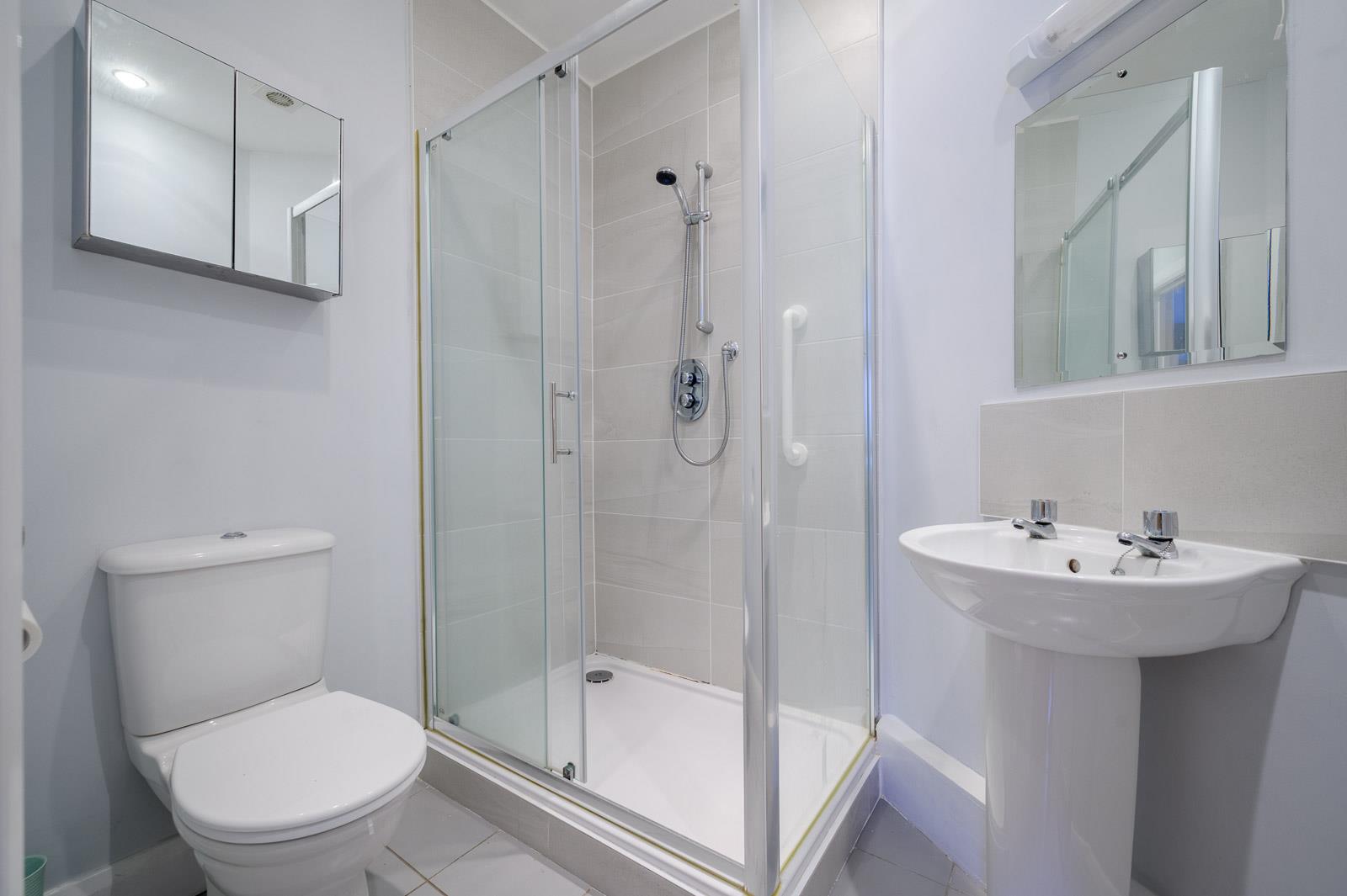 Three piece suite comprising built-in fully tiled shower cubicle, pedestal wash hand basin with tiled splashback, low flush WC, fully tiled floor, part tiled walls, extractor fan