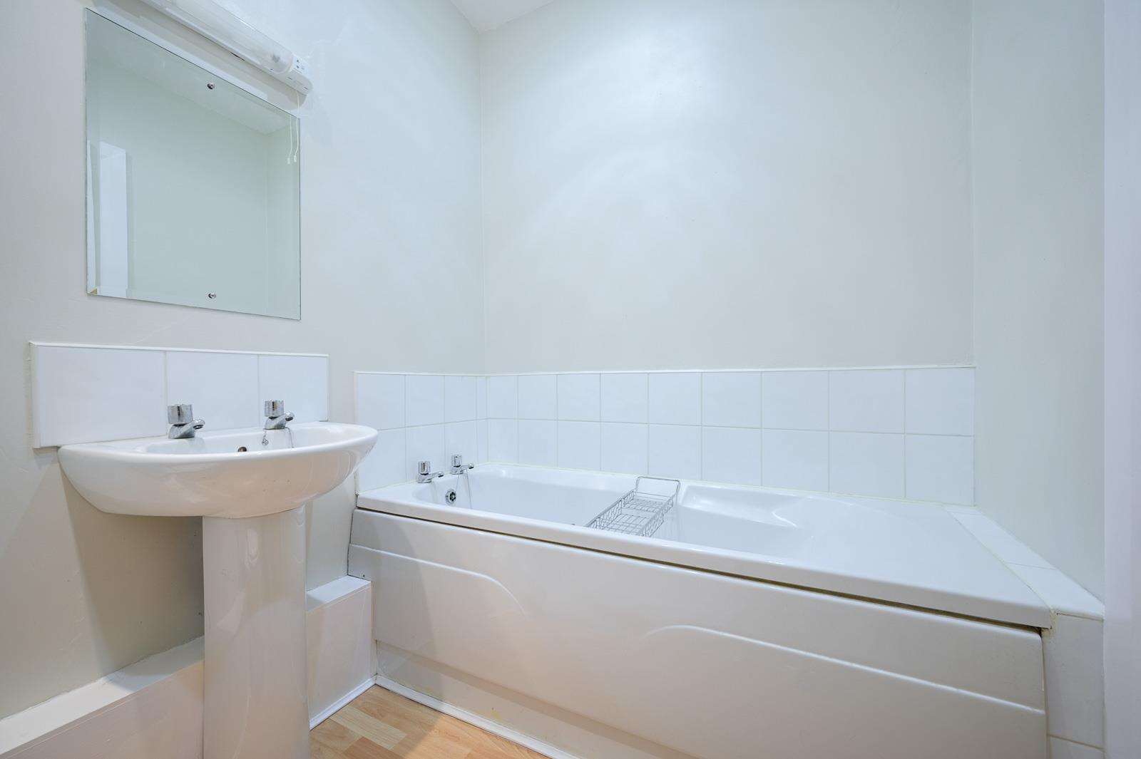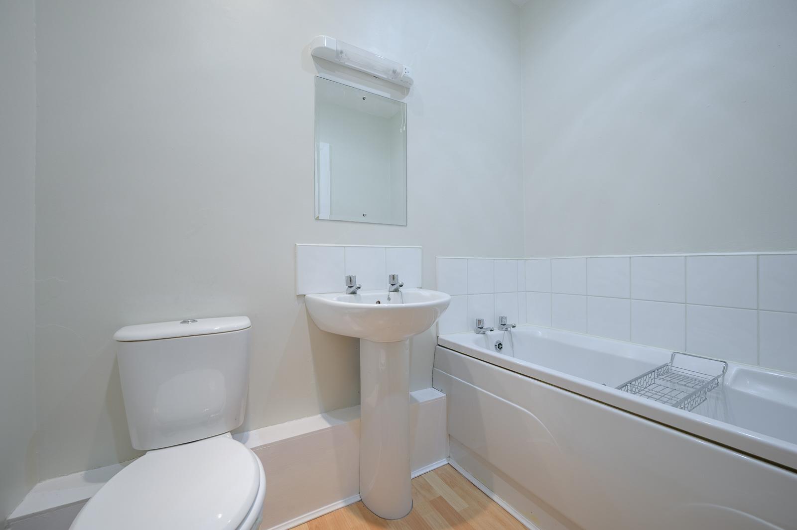 Three piece suite comprising panelled bath with tiled splashback, pedestal wash hand basin, low flush WC, laminate wood effect floor, extractor fan.
