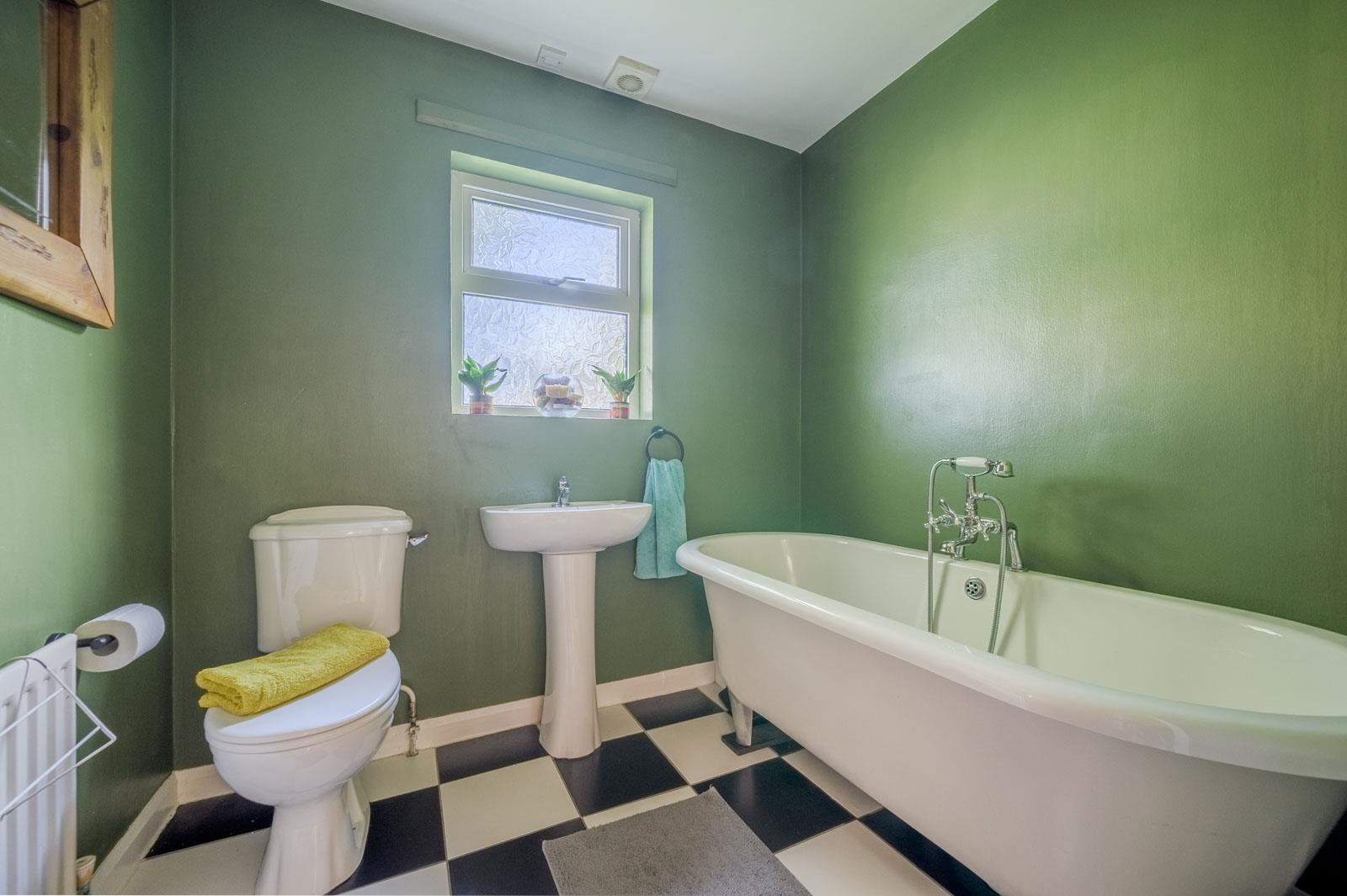 Three piece suite comprising free standing roll top bath with mixer tap, telephone hand shower, pedestal wash hand basin with mixer tap, low flush WC, fully tiled floor.