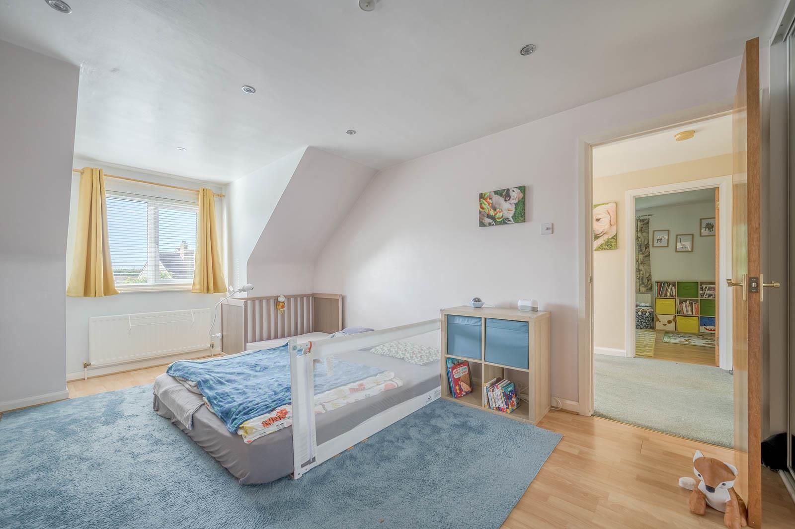Laminate wood effect floor, wall to wall range of built-in wardrobes with mirror front and sliding doors, additional storage in eaves behind.