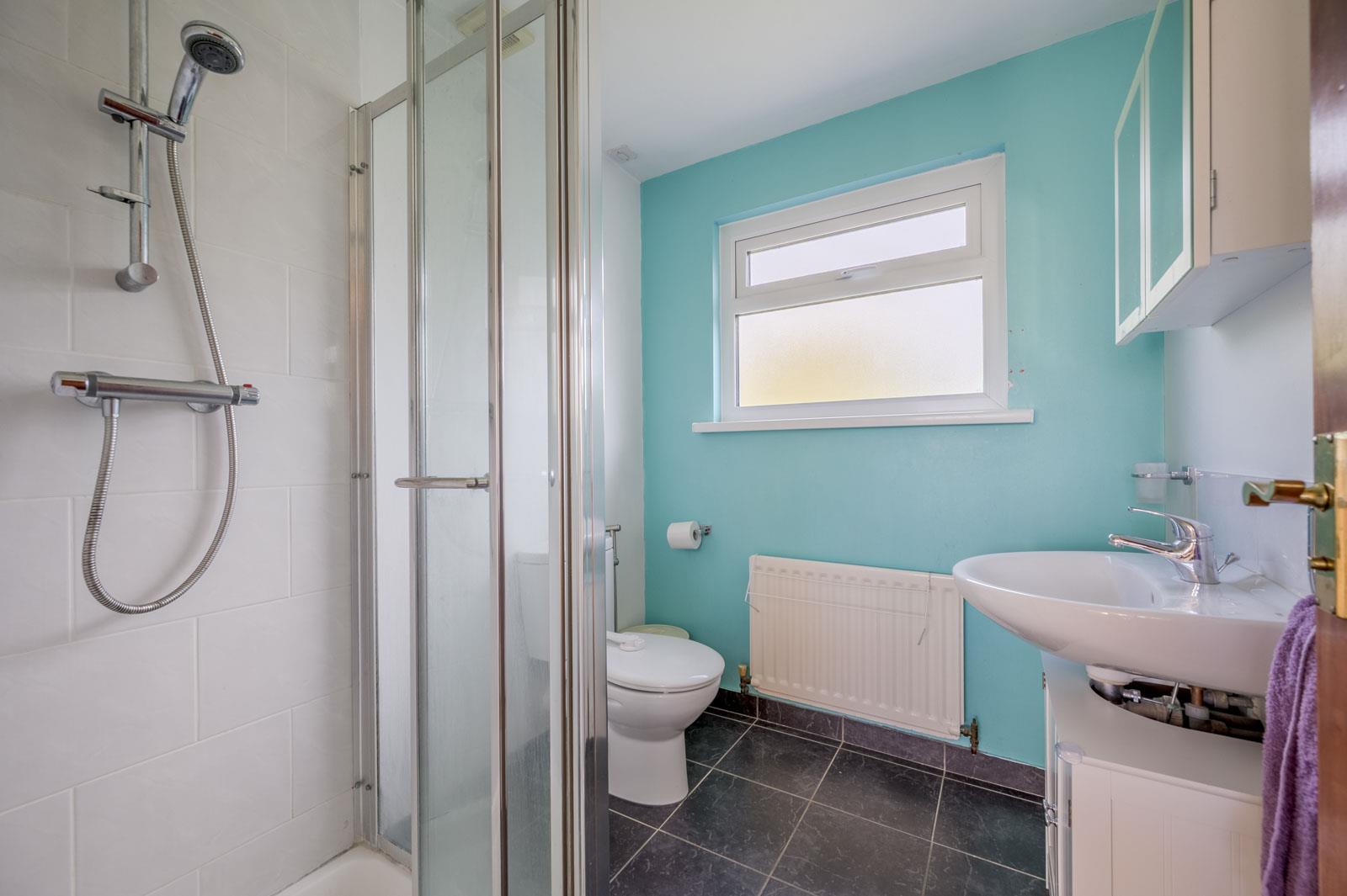 Three piece suite comprising built-in fully tiled shower cubicle, wash hand basin with mixer tap, low flush WC, fully tiled floor, hotpress with lagged copper cylinder.