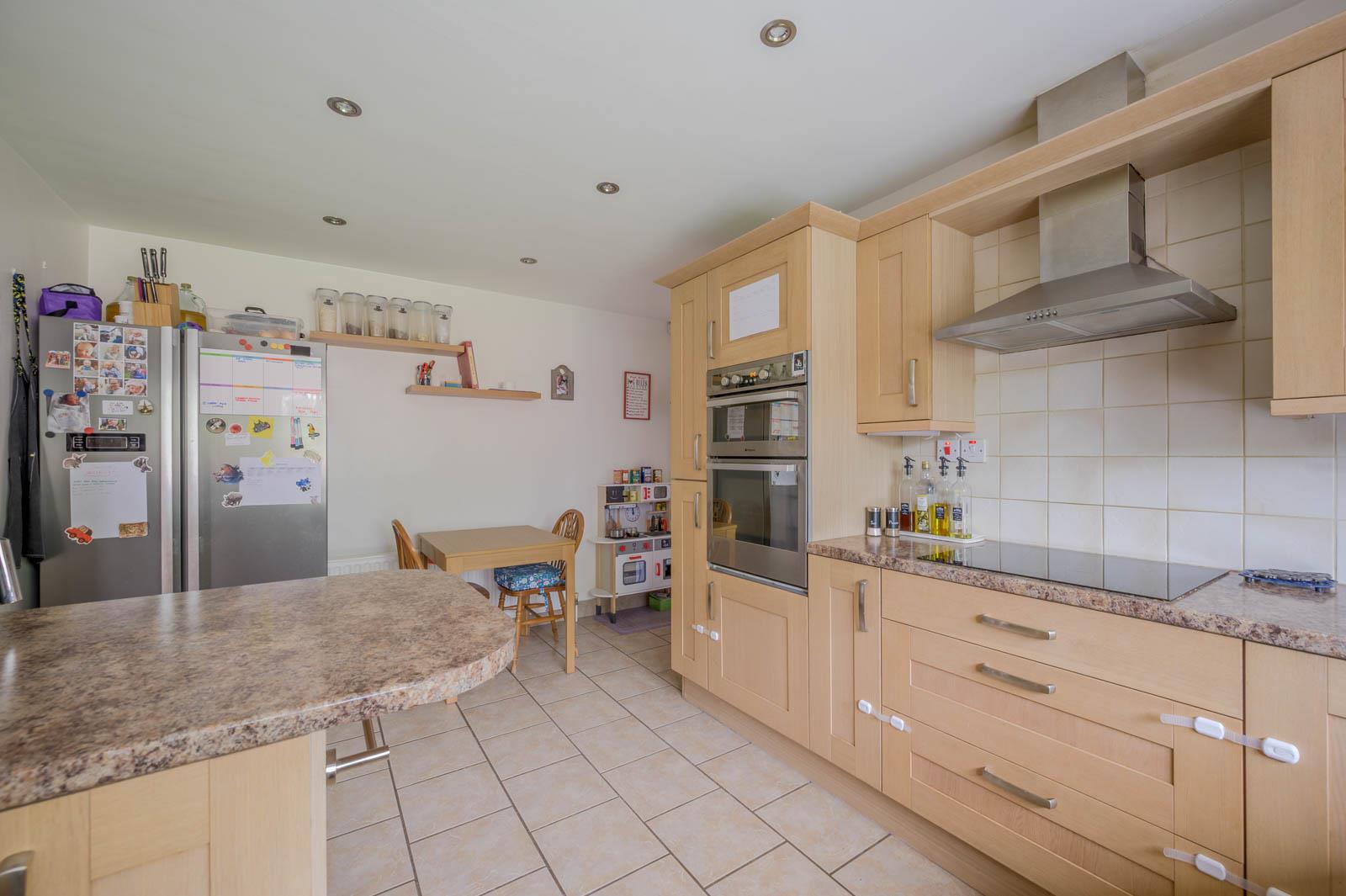 Range of high and low level Shaker style units, granite effect work surfaces, one and a half bowl single drainer stainless steel sink unit with mixer tap, integrated four ring induction hob, tiled splashback, extractor fan above, integrated double oven, space for fridge freezer, plumbed for dishwasher, glass display cabinets, fully tiled floor, part tiled walls.