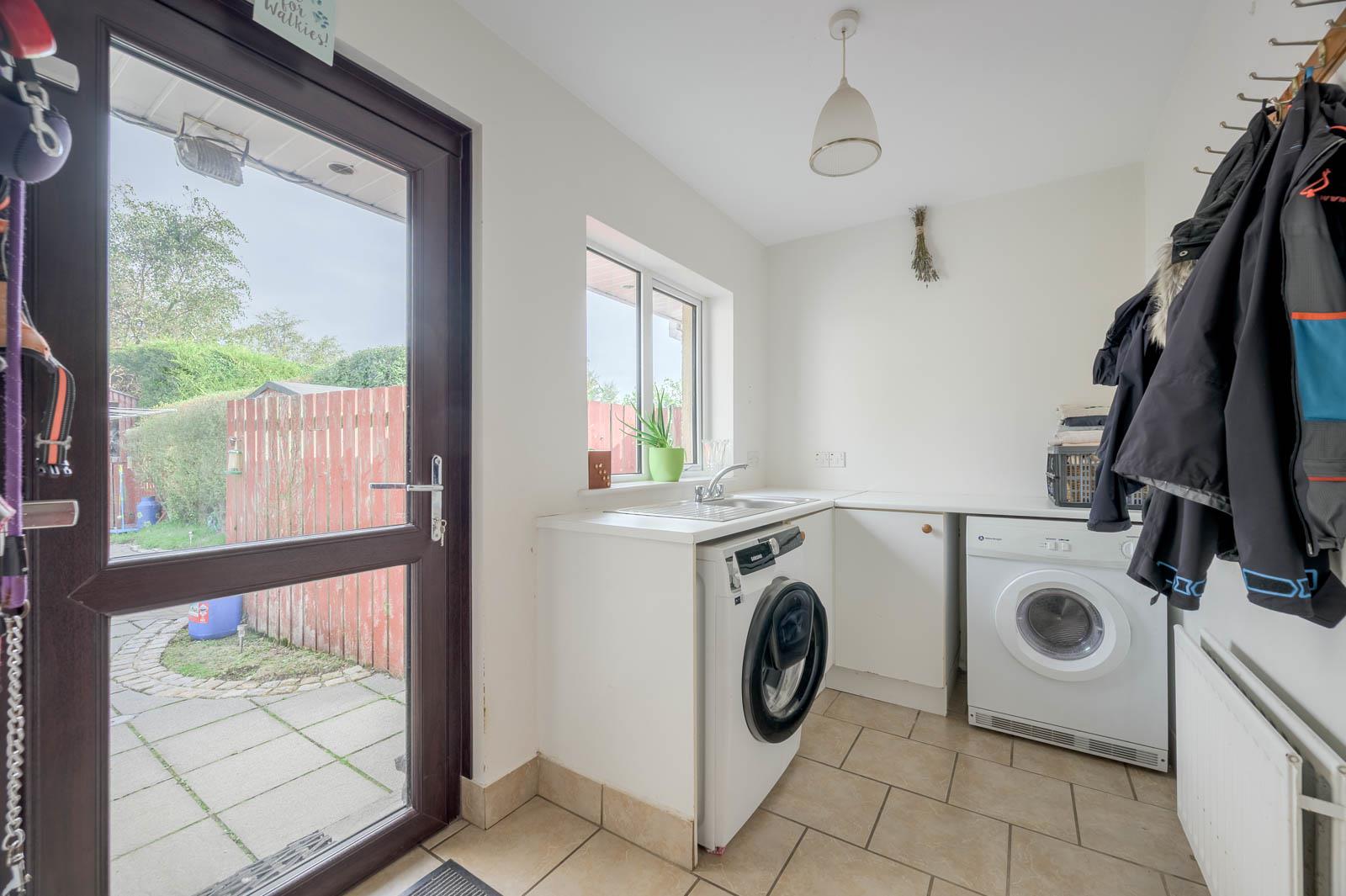 Storage cupboards, laminate work surfaces, single bowl single drainer stainless steel sink unit with mixer tap, plumbed for washing machine, space for tumble dryer, fully tiled floor, door to integral garage, uPVC double glazed door to outside.