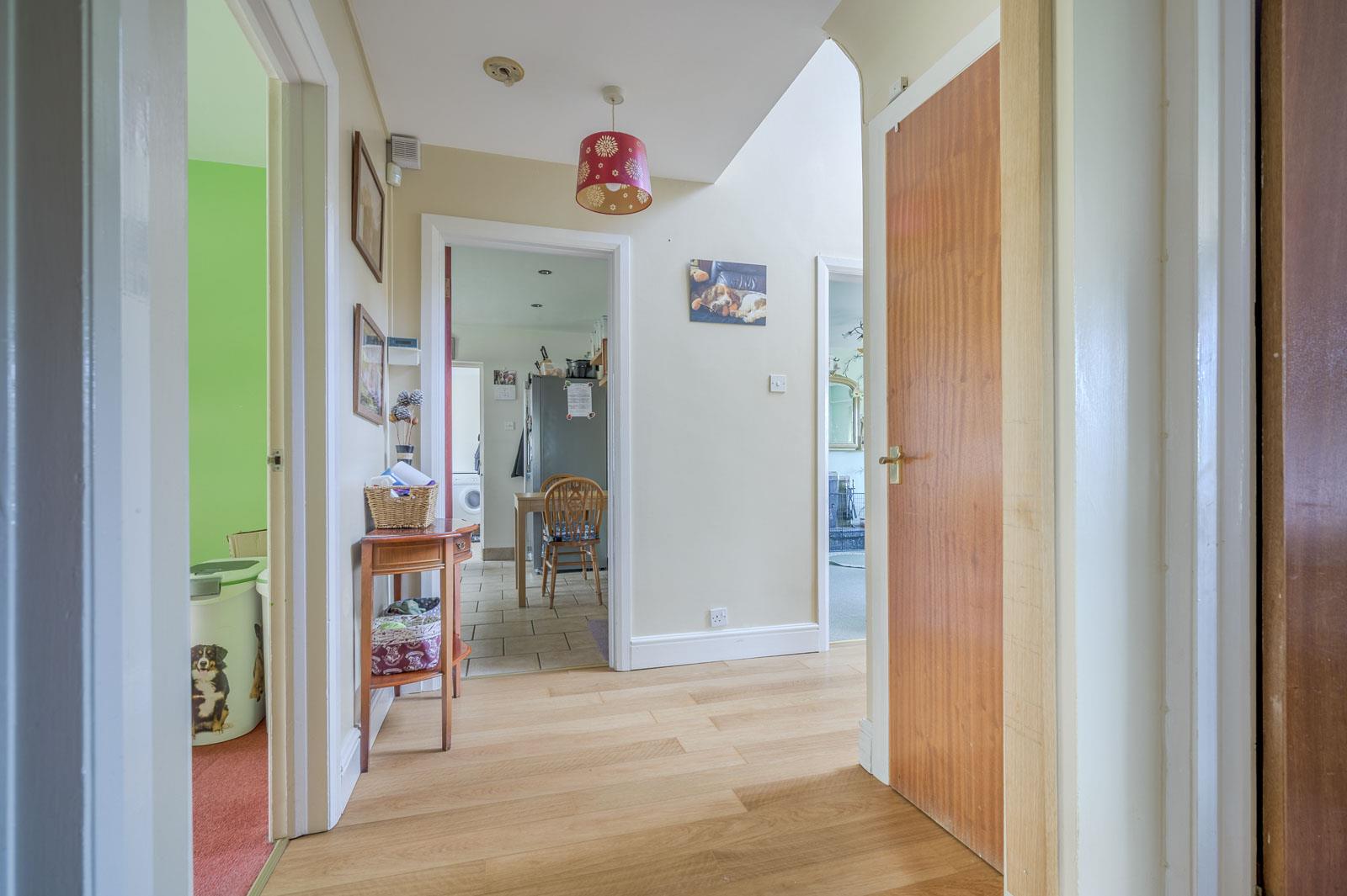 Laminate wood effect floor, vaulted ceiling, storage under stairs.