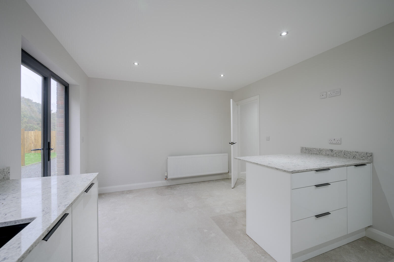 Range of high and low level high gloss units, quartz work surfaces, single bowl sink unit with mixer tap, integrated oven, integrated four ring induction hob with extractor fan above, quartz splashback, integrated dishwasher, integrated fridge freezer, quartz breakfast bar with storage beneath, mature outlook to rear, double glazed door to outside.