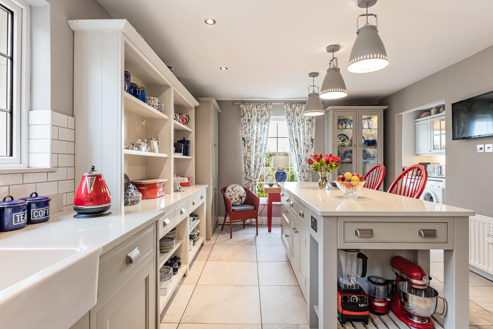 Range of high and low level in-frame hand painted solid wooden units, quartz work surfaces, double bowl sink unit with mixer tap, space for cooker range, tiled splashback, extractor fan above, recess and plumbed for ice dispensing fridge freezer, integrated dishwasher, dresser with storage cupboard, built-in shelving and quartz worktop, large island unit with additional storage, quartz worktop, breakfast bar, glass display cabinets, fully tiled floor, part tiled walls.