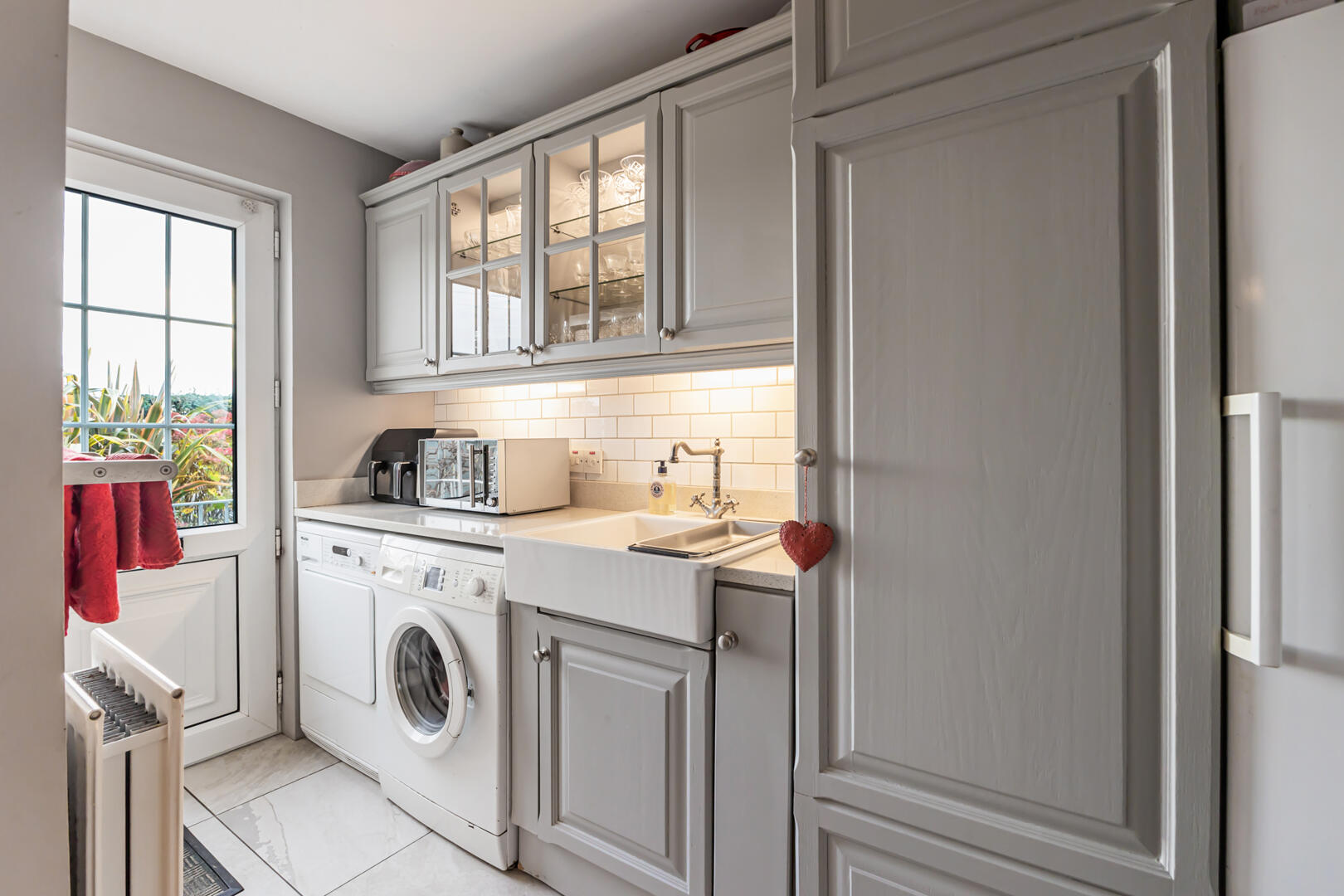 Range of high and low level hand painted solid wooden units, quartz work surfaces, sink unit with mixer tap, plumbed for washing machine, space for tumble dryer, fully tiled floor, part tiled walls, glass display cabinets with built-in lighting, uPVC double glazed door to outside.