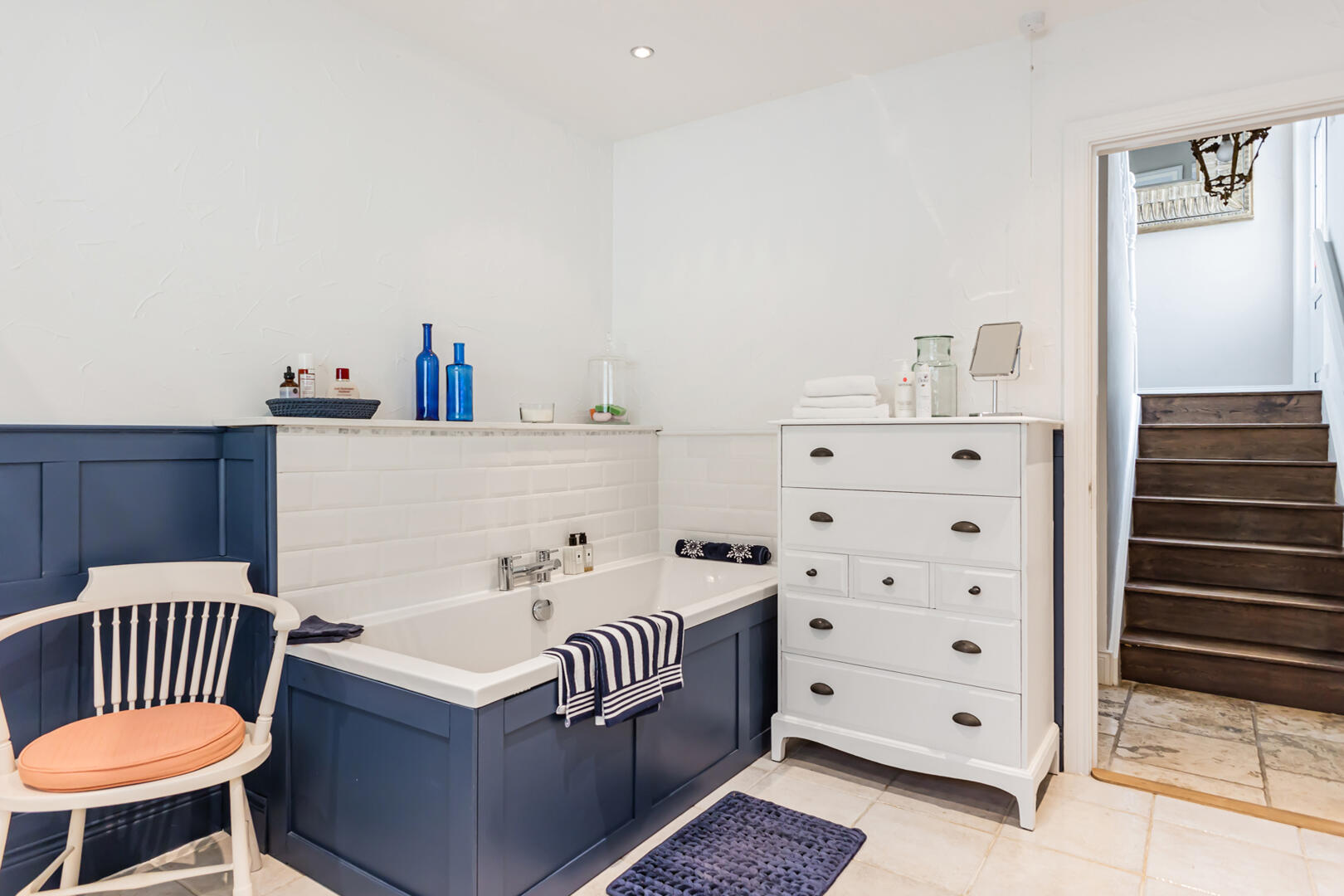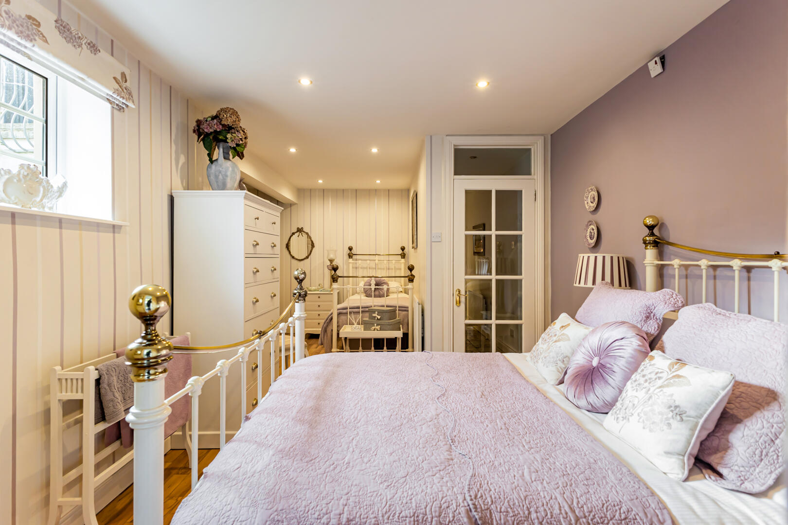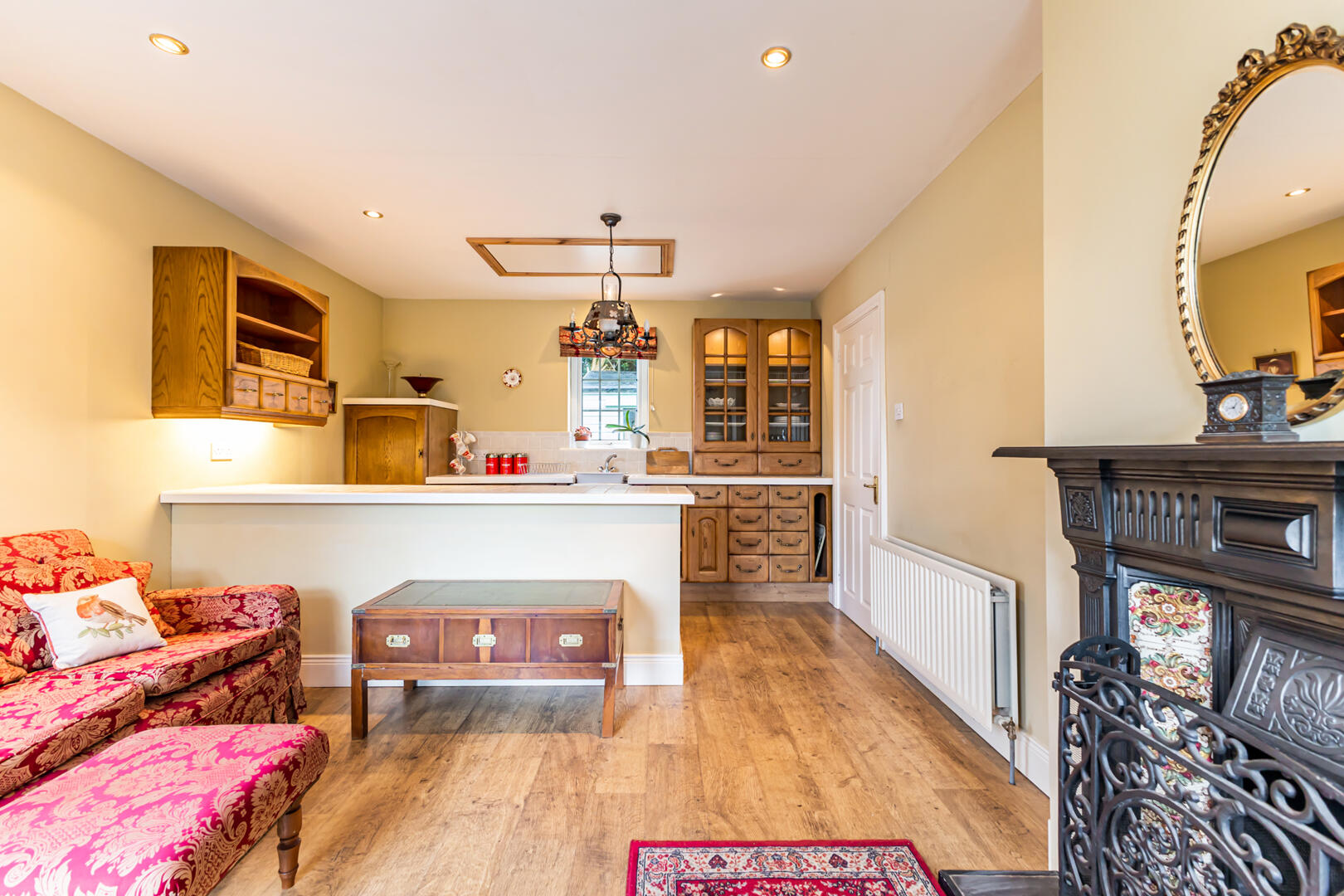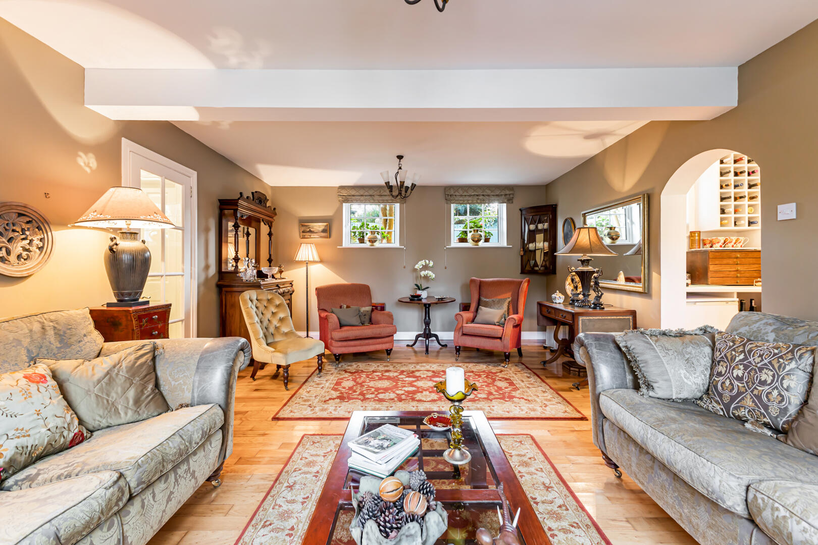 The split-level layout includes a drawing room with Inglenook fireplace and multi-fuel stove, a sitting room, and a superb in-frame hand-painted kitchen with solid wooden units and quartz worktops, open plan to a casual dining/family area. Two bedrooms, including a primary with en suite, plus a cloakroom with WC complete the ground floor. The lower level features a family room with wooden flooring and French doors to the courtyard, three further bedrooms-one with an en suite wash room-and an annexe with open plan living/kitchen area. A five-piece bathroom and an office with solid oak flooring add further versatility.