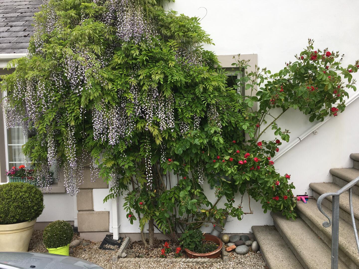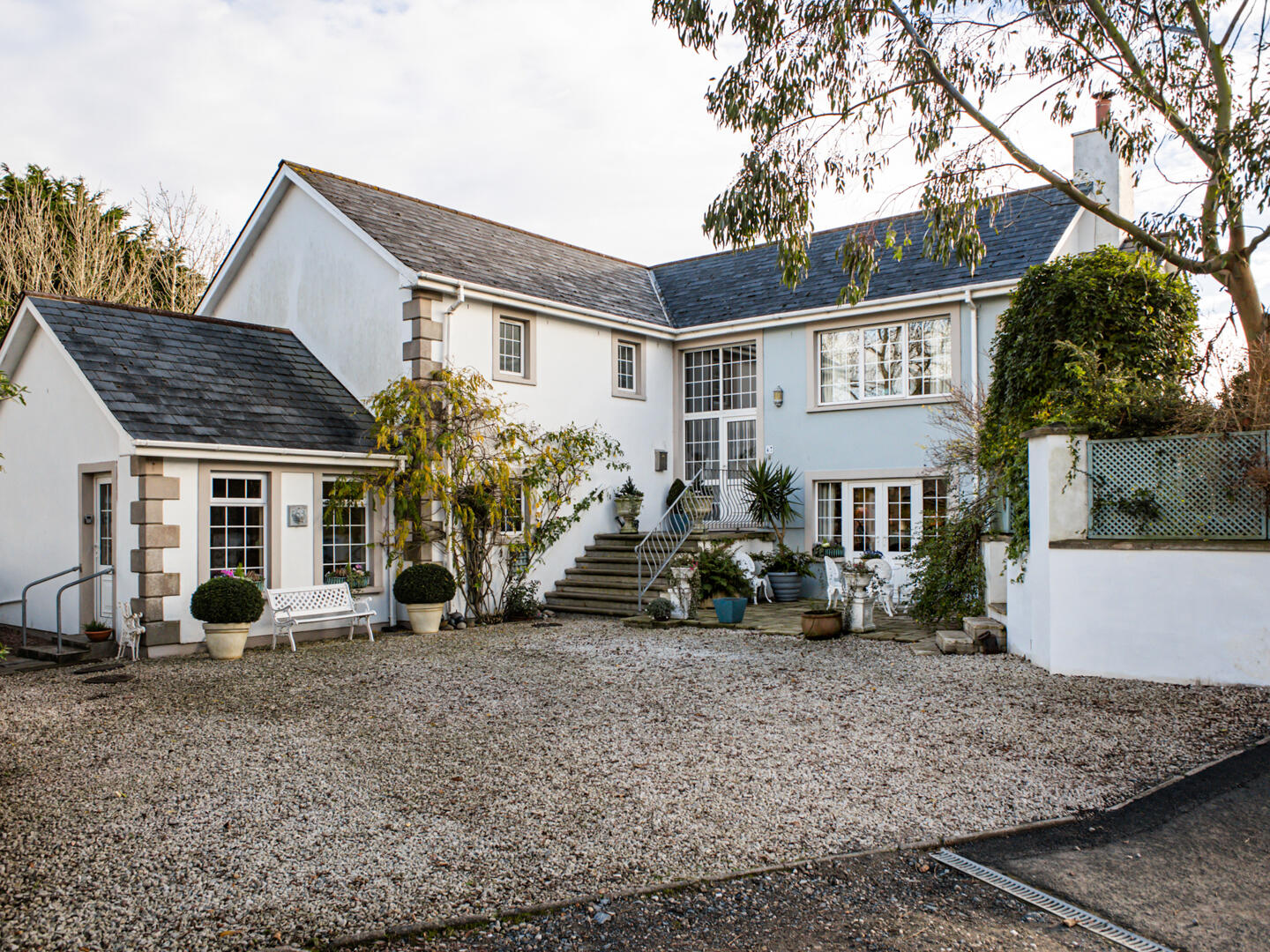 Beautifully presented mature landscaped gardens surrounding the property with lawns, vast array of colourful flowers, plants, trees and shrubs, extensive paved terrace areas and pathways, driveway leading to two parking areas, one at the front in loose stones and one at the rear in loose stones with space for cars, caravans, boats, horse boxes, etc, timber decked terrace and sitting area.