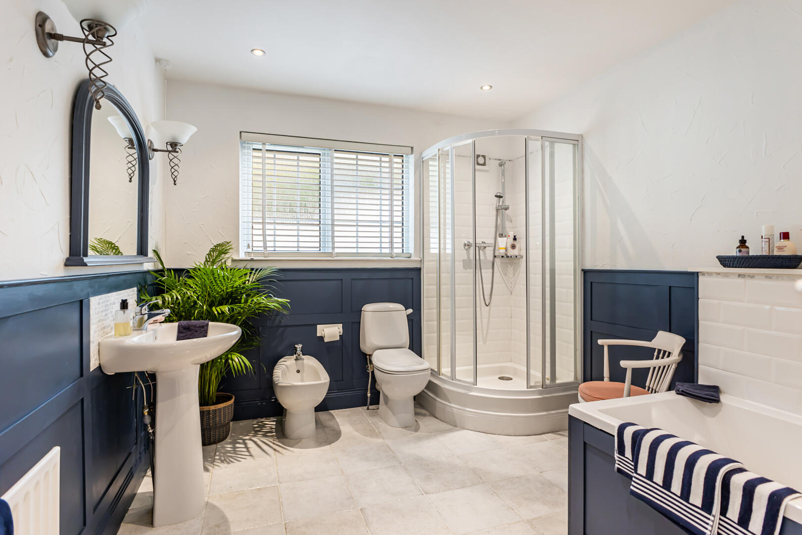 Five piece suite comprising panelled bath with mixer tap, separate built-in fully tiled shower cubicle with Bristan shower unit, pedestal wash hand basin, mixer tap, tiled splashback, low flush WC, bidet, fully tiled floor, painted wood panelled walls, extractor fan.