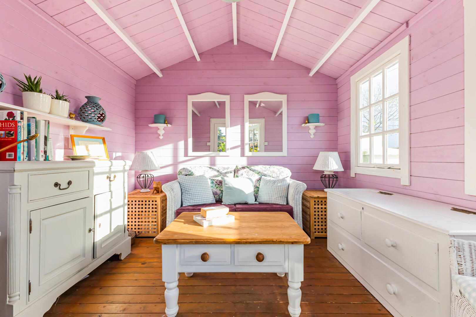 Two piece white suite comprising low flush WC, pedestal wash hand basin, mixer tap, fully tiled floor, part tongue and groove walls, access to roofspace.