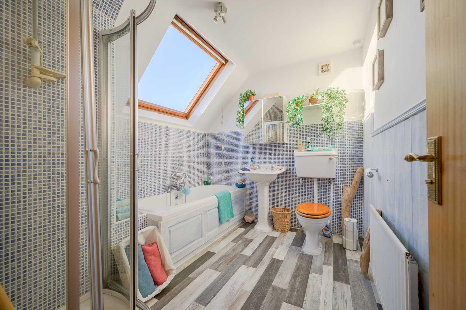 Four piece suite comprising panelled bath with mixer tap, telephone hand shower, separate built-in fully tiled shower cubicle with Triton electric shower, pedestal wash hand basin, low flush WC, part tiled walls, part tongue and groove walls, extractor fan, Velux window.