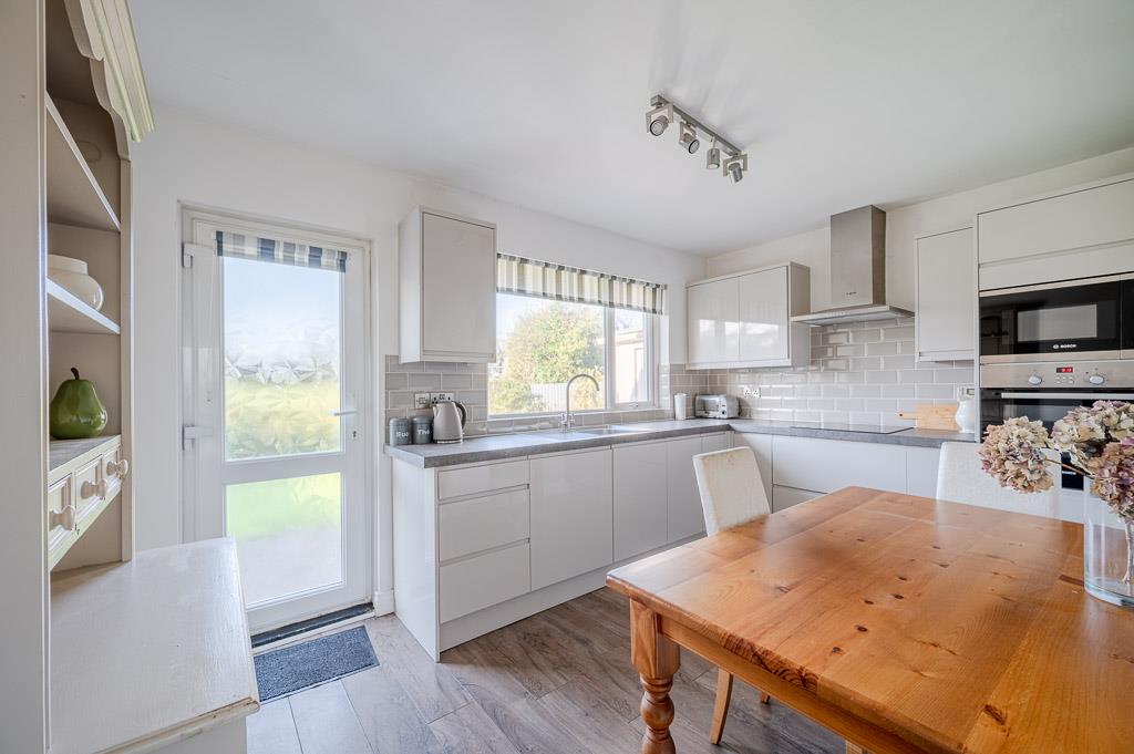 Range of high and low level high gloss units, granite effect work surfaces, Franke single bowl stainless steel sink unit with mixer tap, integrated Bosch four ring induction hob, integrated Bosch oven and integrated Bosch microwave above, integrated Bosch dishwasher, cupboard for fridge freezer, laminate wood effect floor, part tiled walls, aspect overlooking the rugby pitches, uPVC double glazed door to outside.