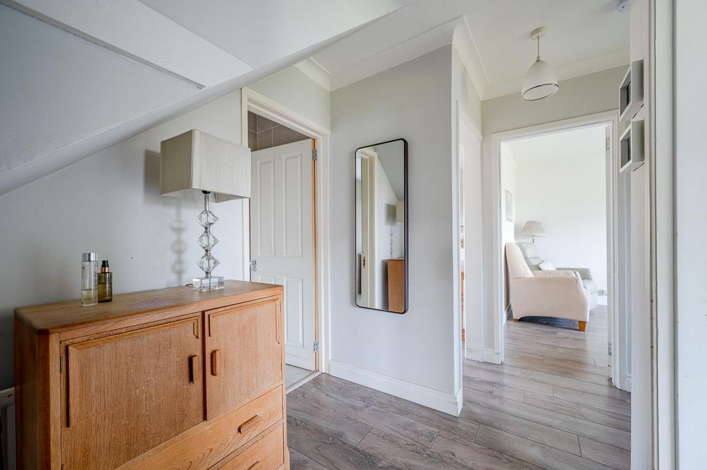 With three piece suite comprising built-in fully tiled shower cubicle with Mira electric shower, wash hand basin with mixer tap, storage beneath, low flush WC, shelved airing cupboard, fully tiled floor, fully tiled walls, chrome heated towel rail.