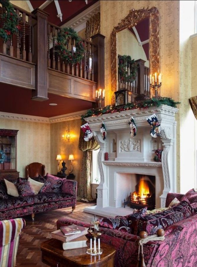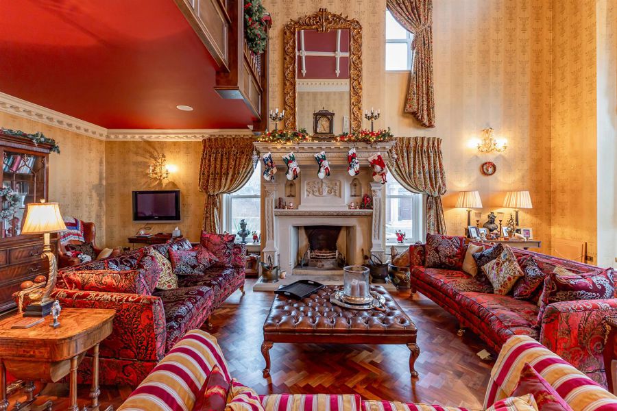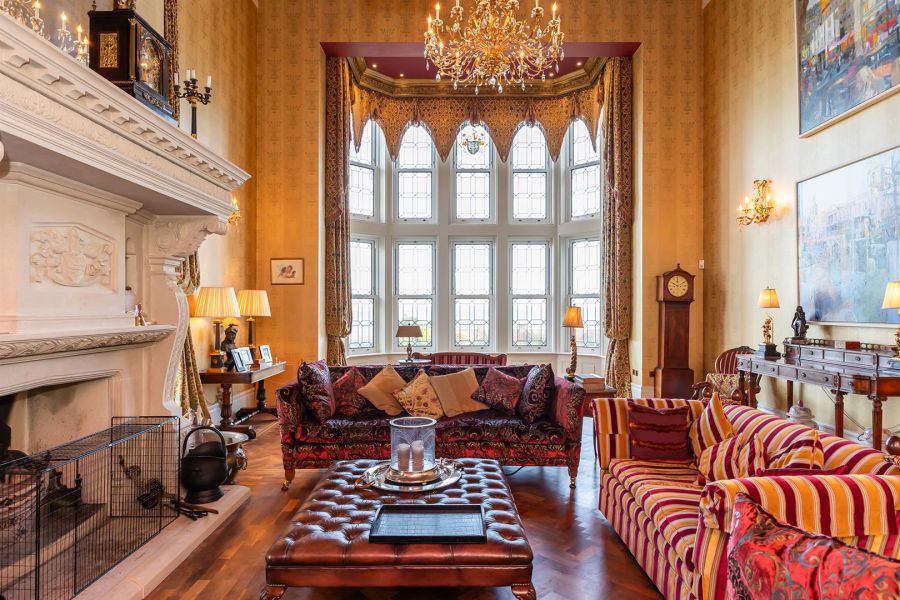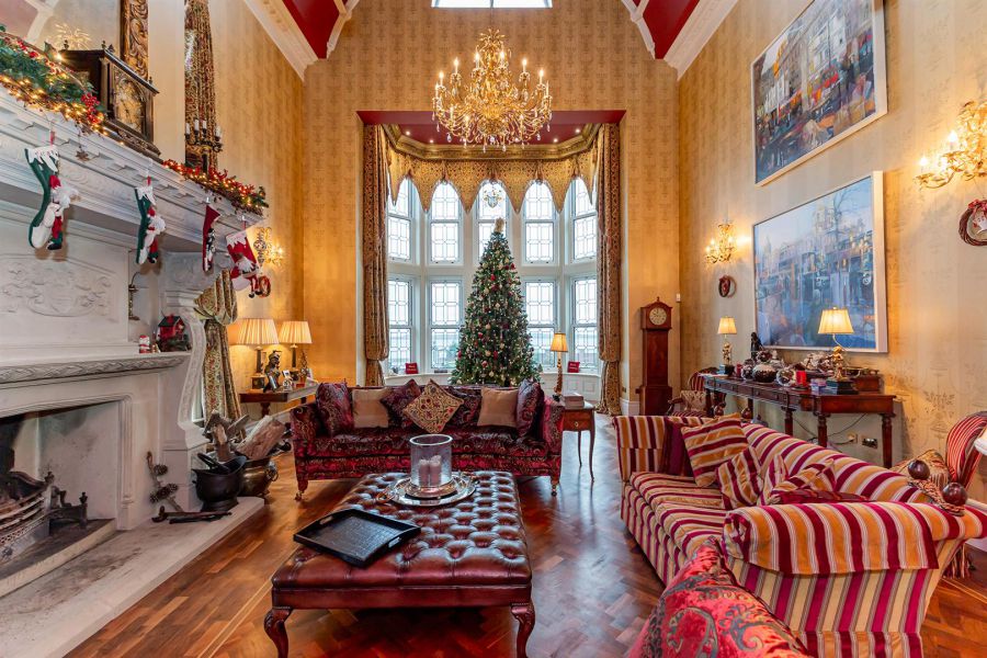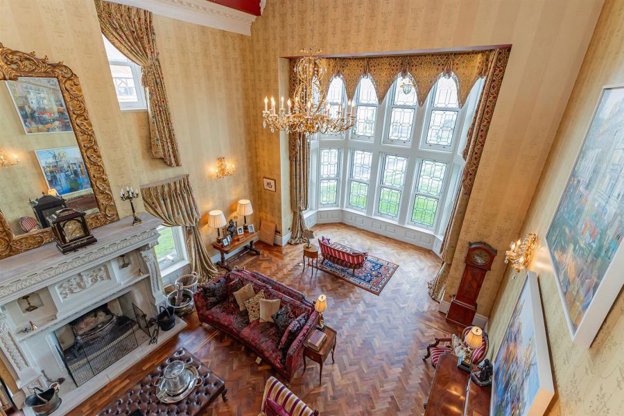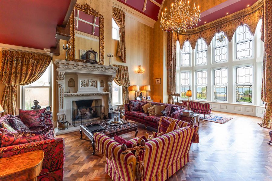 French doors with glazed and bevelled insets from reception hall, feature cathedral ceiling, Italian limestone fireplace and hearth with open fire, solid walnut parquet herringbone flooring, stunning views of Donaghadee Sound, Copeland Islands, Irish Sea and beyond, built-in sound system, ornate cornice ceiling, minstrel gallery.