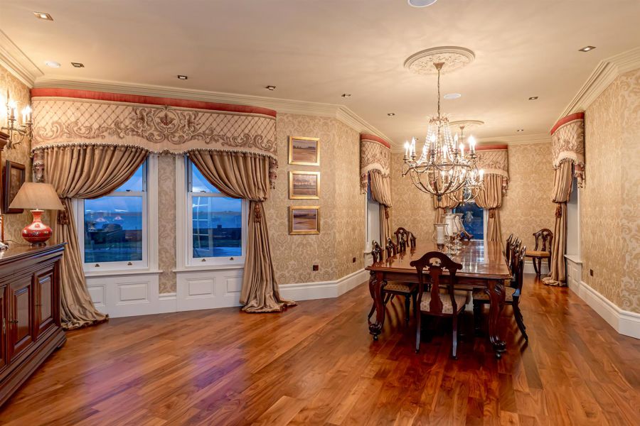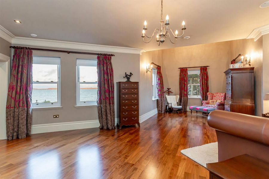 Stunning views over Donaghadee Sound, Copeland Islands, Irish Sea and beyond, Kahrs engineered walnut flooring, ornate cornice ceiling, built-in sound system, vaulted ceiling.