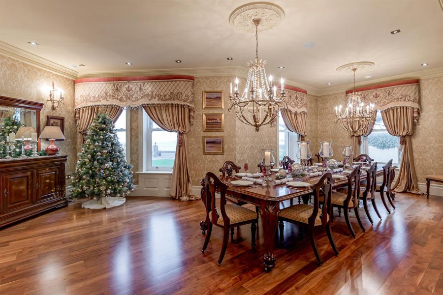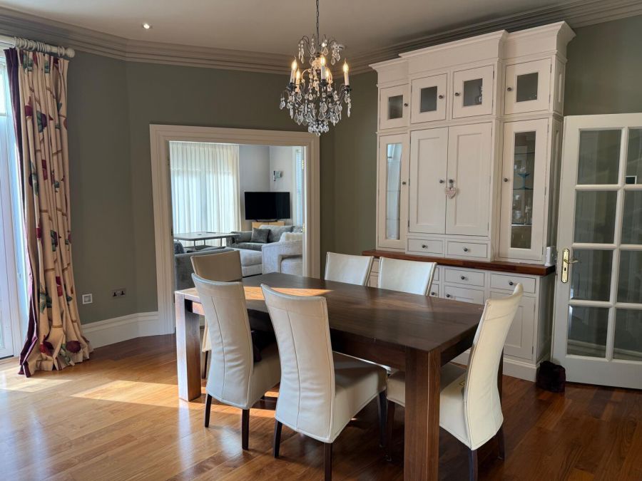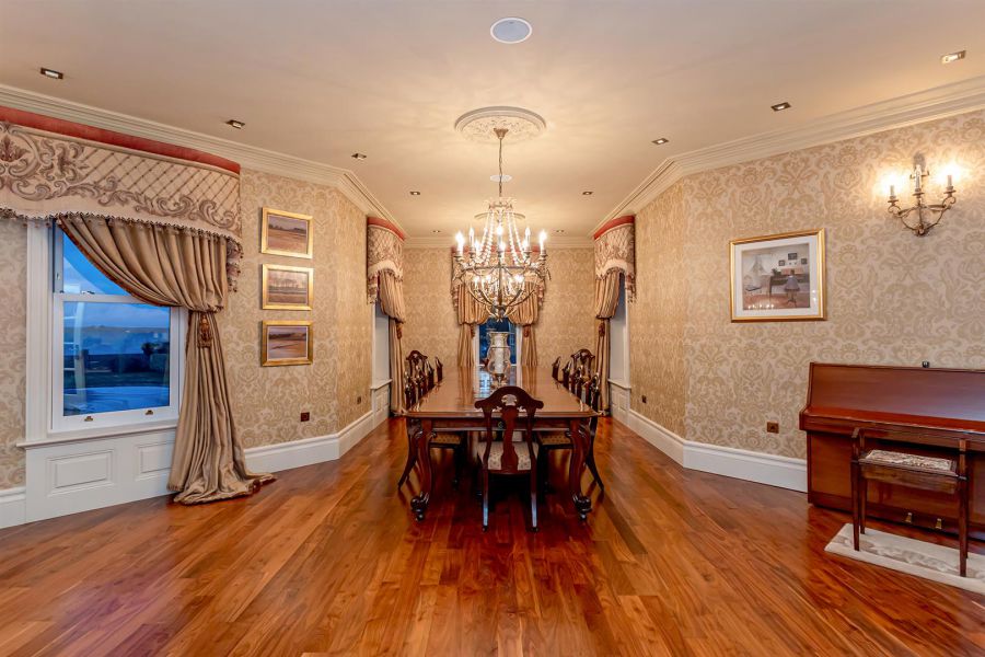 Kahrs engineered walnut wooden floor, stunning views of Donaghadee Sound, Copeland Islands, Irish Sea and beyond, ornate cornice ceiling, French doors with glazed and bevelled insets from reception hall, two ceiling roses, built-in sound system.