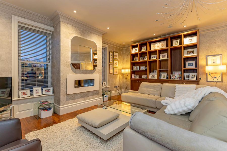 Solid walnut wooden floor, ornate cornice ceiling, built-in sound system, feature gas fire, double glazed French doors to outside, aspect overlooking the rear garden.