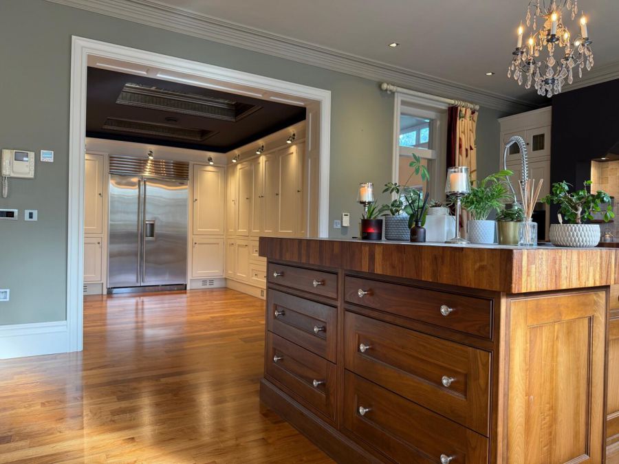 With additional range of extensive storage units, plumbed for washing machine, feature stained glass ceiling windows, integrated ice dispensing double sub zero fridge freezer, comms cupboard with sound system, Kahrs engineered walnut floor.