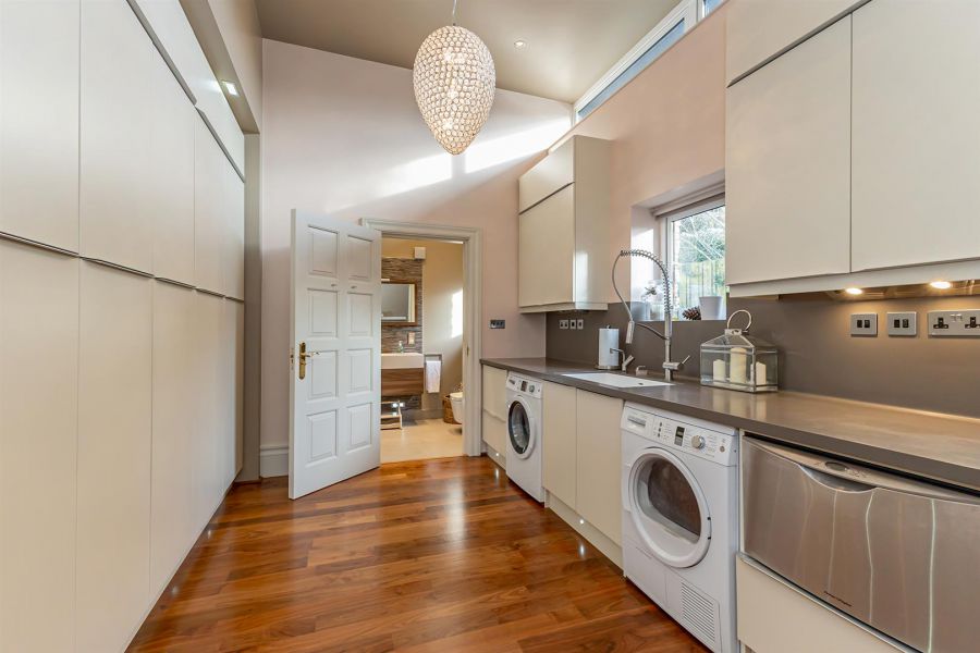 Utility Room with Kahrs Engineered Walnut Flooring, Extensive Fitted Units, Quooker Boiler Tap and Waste Disposal, Leading to Shower Room with Double Shower