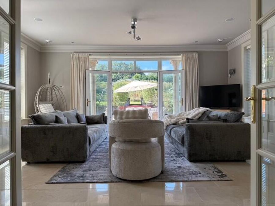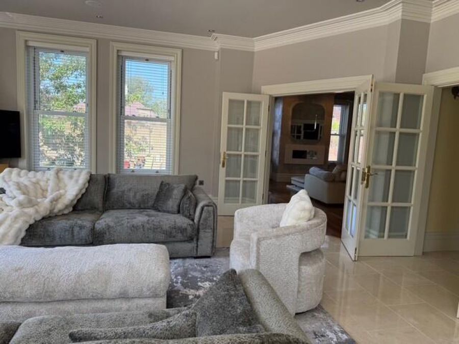 Three sets of French doors with glazed and bevelled insets from family room, reception hall and kitchen, built-in sound system, ornate cornice ceiling, uPVC double glazed French doors to rear garden, aspect overlooking rear garden.