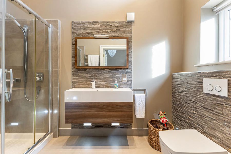 Three piece suite comprising built-in shower cubicle with two showers, wash hand basin with mixer tap, storage beneath, low flush WC, fully tiled floor, part tiled walls, chrome heated towel rail.