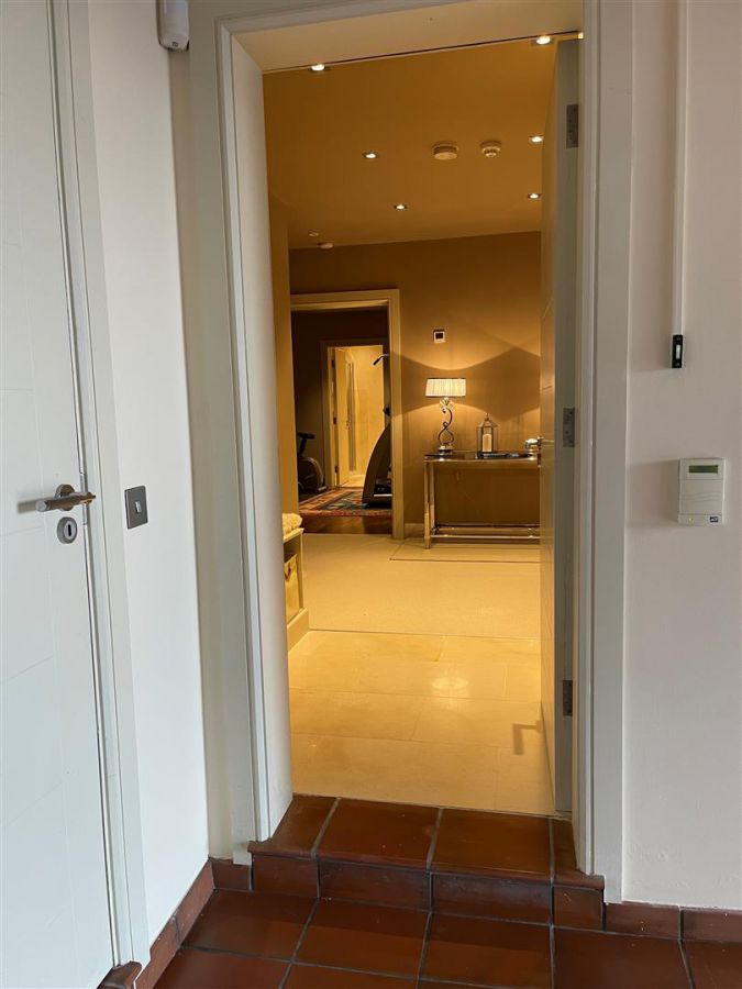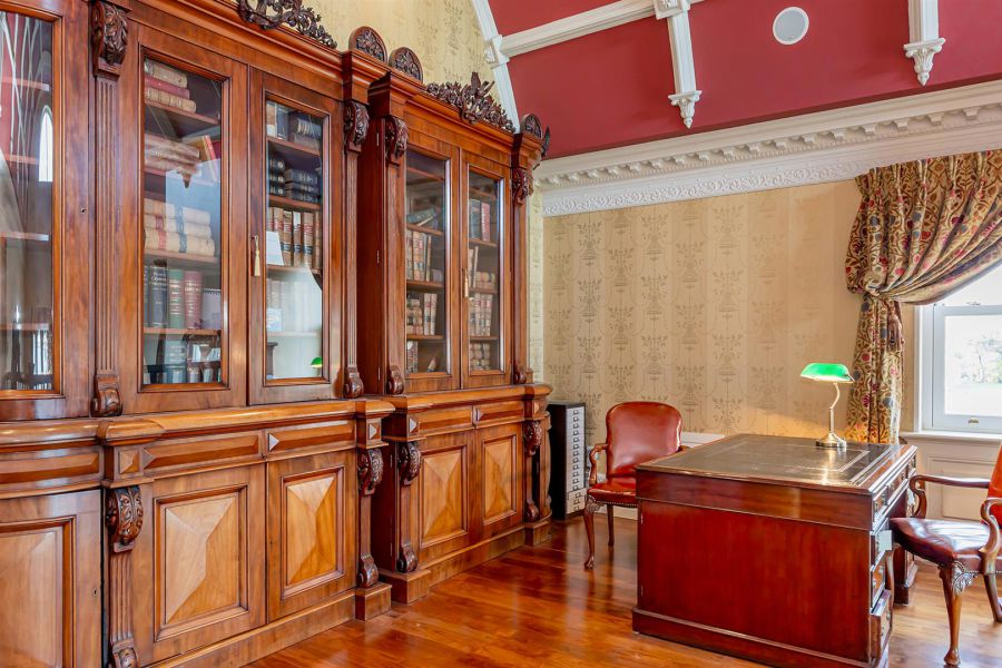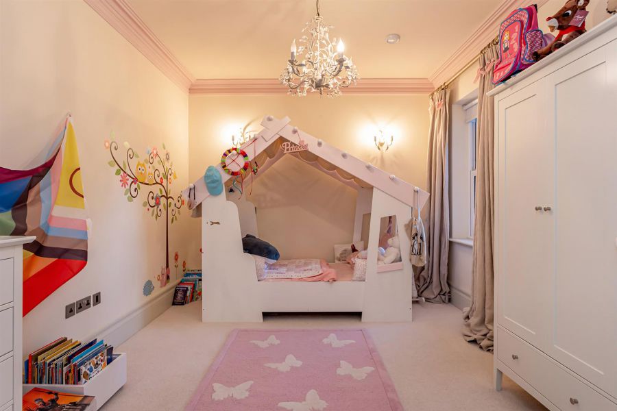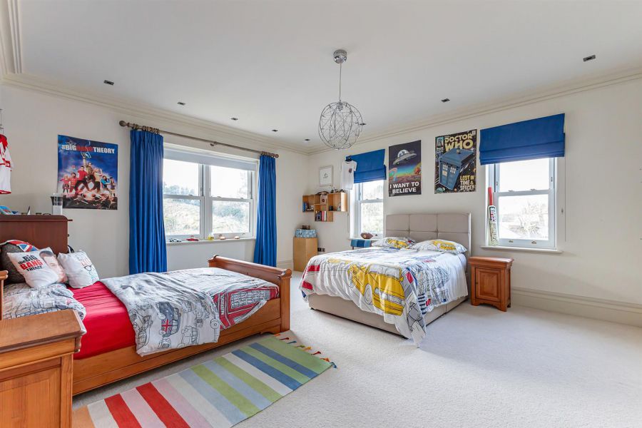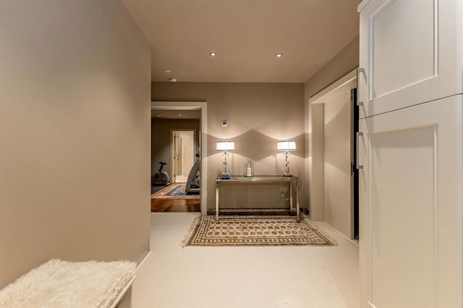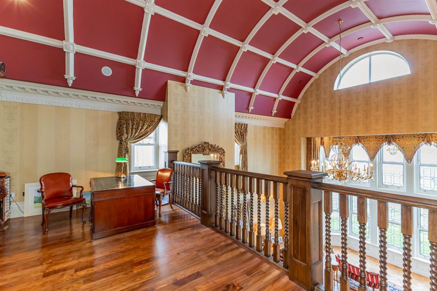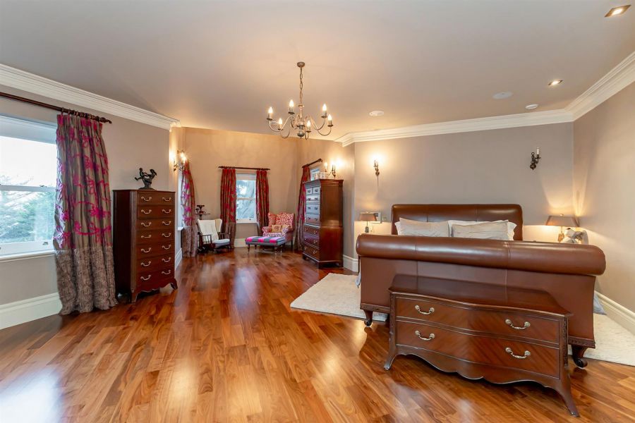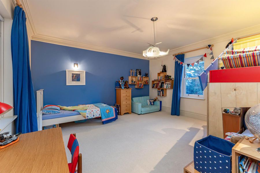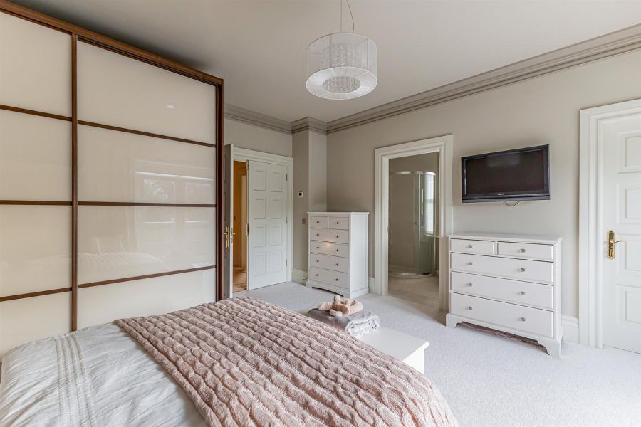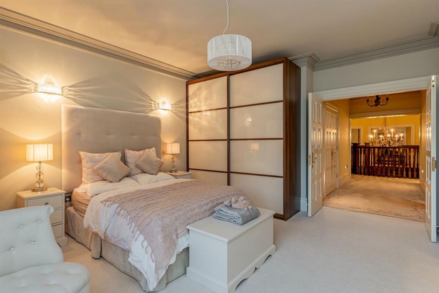 Vaulted ceiling, built-in wall lighting, access to study/office, Kahrs engineered walnut floor, minstrel gallery overlooking drawing room, built-in sound system, large walk-in linen cupboard with automatic sensor lighting and access to roofspace with potential to convert subject to necessary approvals, ornate cornice ceiling.