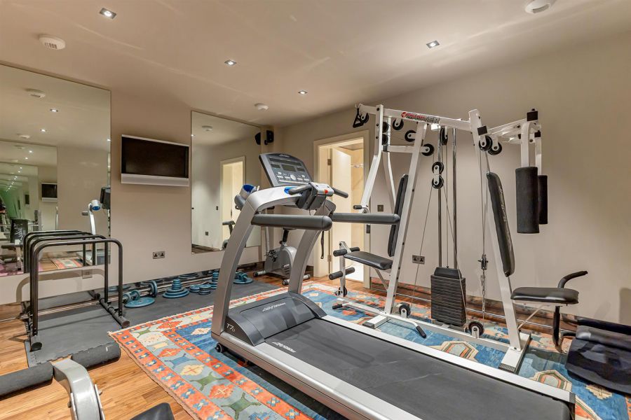 Gym with Kahrs Engineered Walnut Floor, Keypad for Media and Wall Speakers