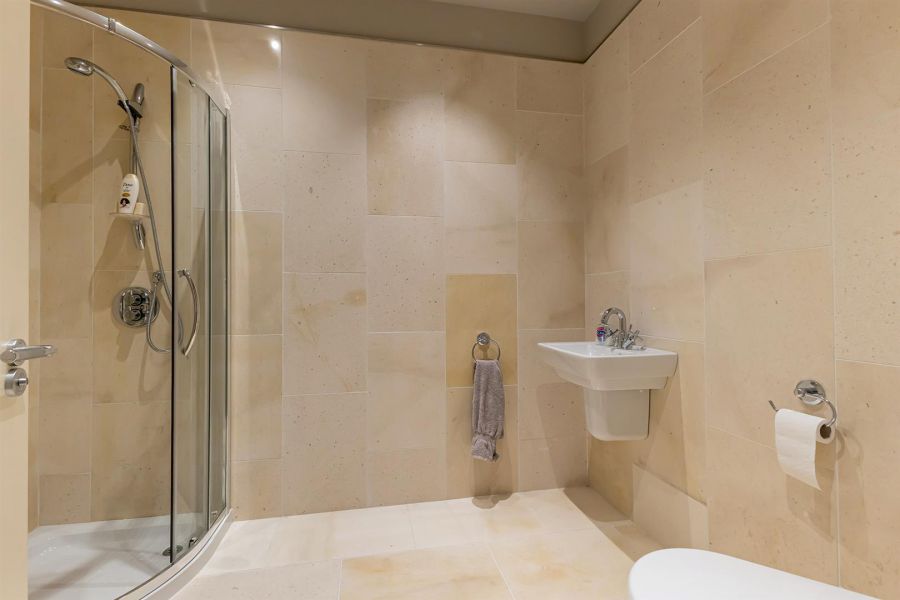 Three piece white suite comprising built-in fully tiled shower cubicle, floating wash hand basin with mixer tap, low flush WC, limestone floor, part tiled marble walls, chrome heated towel rail.