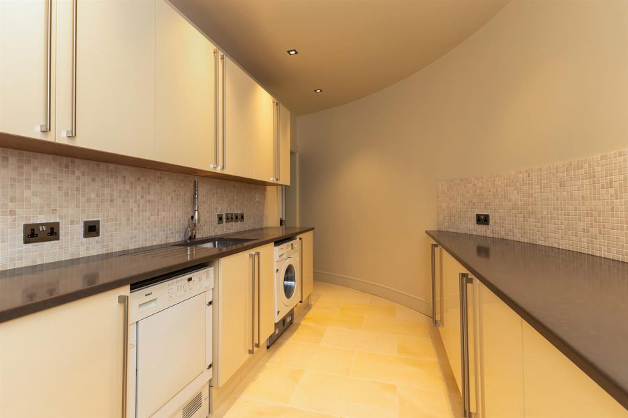 Range of high and low level high gloss units, composite work surfaces, stainless steel sink unit with double drainer and mixer tap, plumbed for washing machine, space for tumble dryer, space for fridge freezer, limestone floor, part tiled walls, automatic sensor lighting.