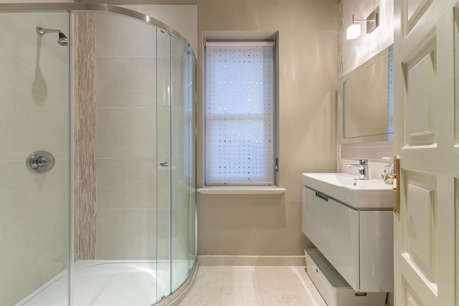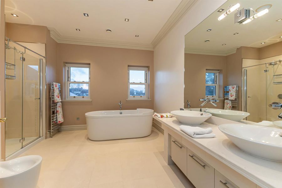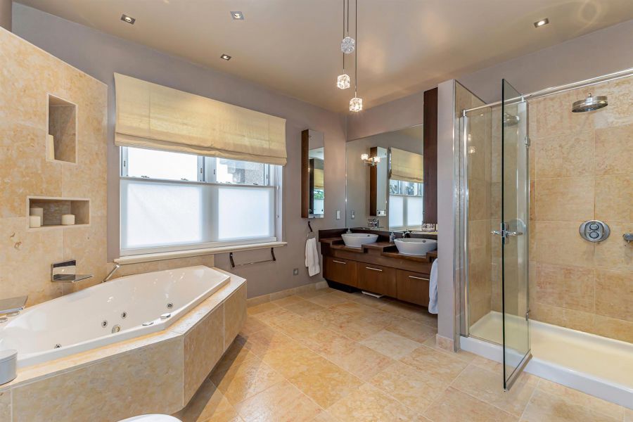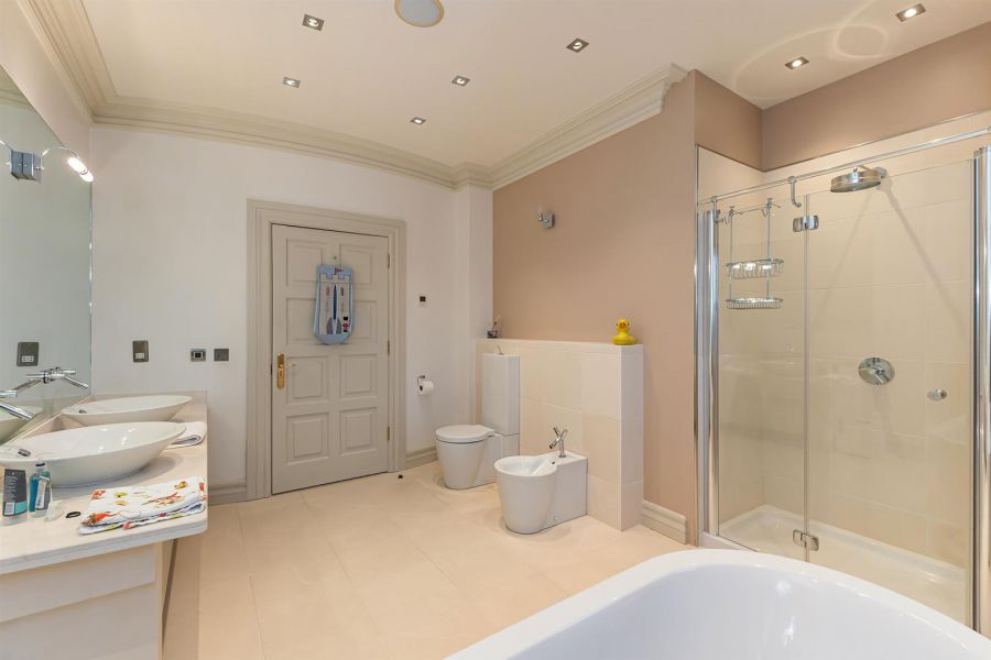 Five piece suite comprising Duravit Jacuzzi Jet bath with mixer tap and hand shower, separate built-in fully tiled shower cubicle with power jets, twin wash hand basins with mixer taps, low flush WC, fully tiled Jerusalem marble tiled floor, chrome heated towel rail, part Jerusalem marble tiled walls, built-in sound system.