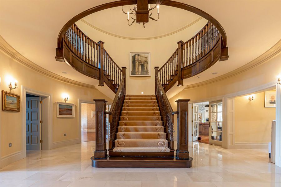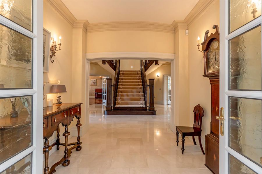 The magnificent accommodation extends to around 8,000 square feet and offers a multitude of layouts to suit the needs of the owners. As viewers enter the property they will instantly notice the owner"s attention to detail as well as the quality within this exquisite home. It is safe to say that no expense has been spared. A striking lobby and circular hall with Italian polished marble floor and ceiling speakers allows access to all ground floor reception rooms highlighting the thought that has gone into creating a fabulous environment for the lucky purchaser. Undoubtedly the room of the house is the drawing room with cathedral ceiling, walnut parquet floor and limestone fireplace imported from Italy and ceiling speakers remote controlled on media system. There is also a dining room with Kahrs engineered walnut flooring, ceiling speakers and keypad access to a media system. There is also a family room with Kahrs engineered walnut floor, ceiling speakers and feature gas fire, sun room with Italian marble floor, ceiling speakers and French doors to the rear garden and a superb kitchen with extensive range of inset units which are a stylish mixture of walnut and hand painted. There are also white marble worktops, Millennium Edition four oven Aga, range of integrated appliances, media sound system, ceiling speakers and adjoining pantry with backlit stained glass feature lighting. A utility room with a Quooker tap, excellent storage and Kahrs engineered walnut floor leads to a shower room with a double shower. A concealed entrance from the reception hall leads to a lower level which boasts a large cinema room, with surround sound and 3D projector, which is an ideal space for children at play or unwinding with your feet up. There is also a gym with media keypad and wall speakers as well as a shower room and second utility room.