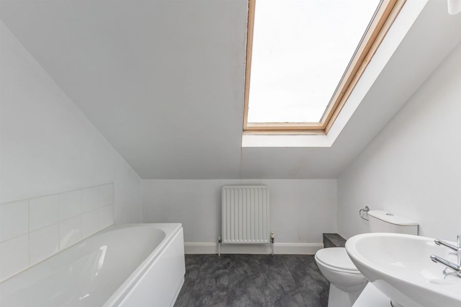With white suite comprising pedestal wash hand basin, panelled bath with chrome mixer tap and telephone hand shower, tiled splashback, low flush WC, Velux window.