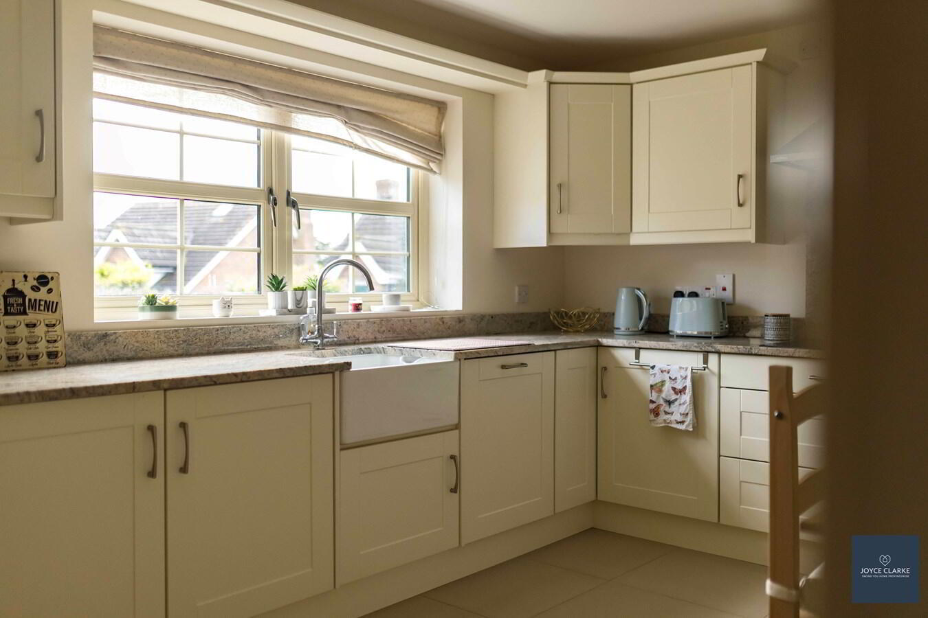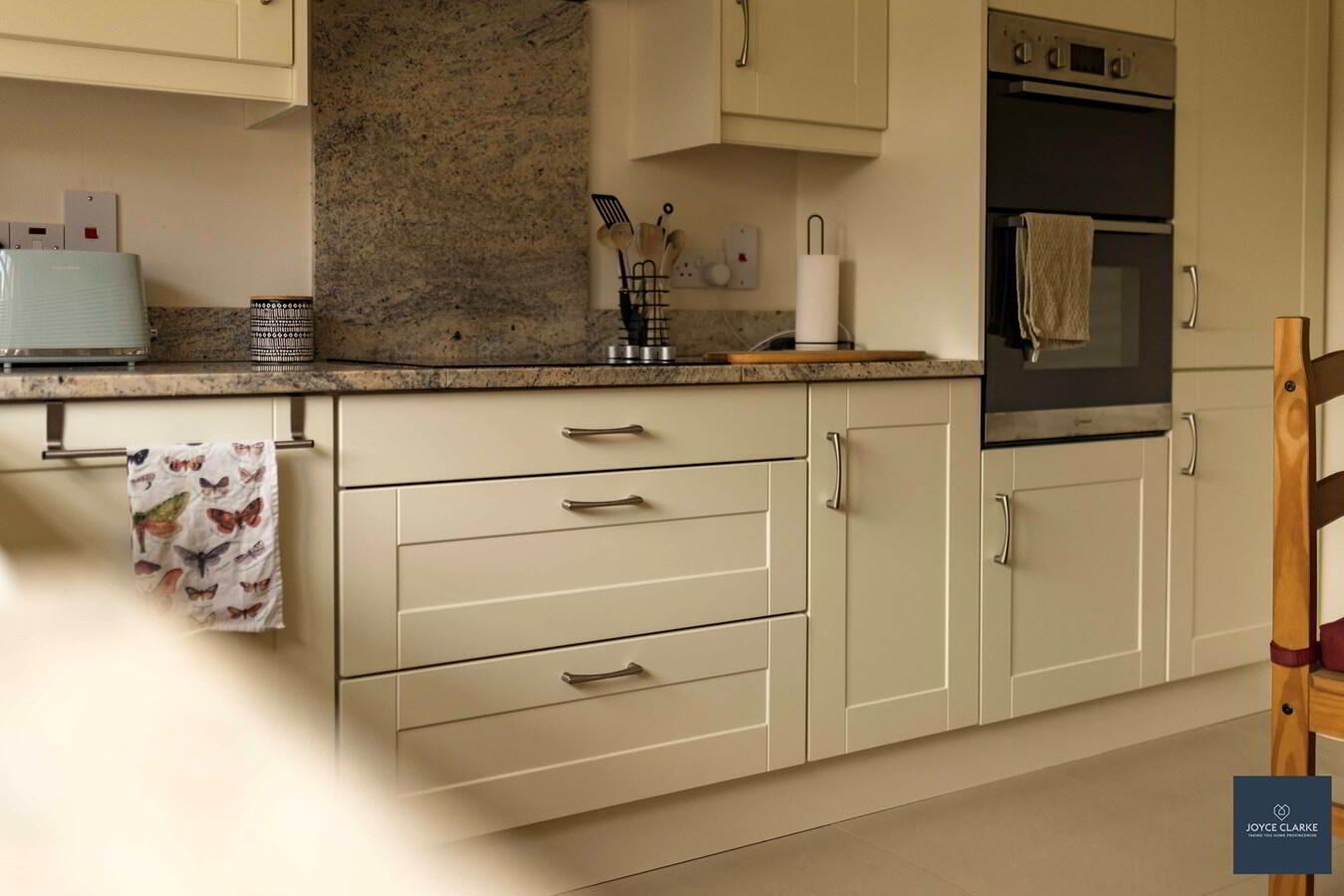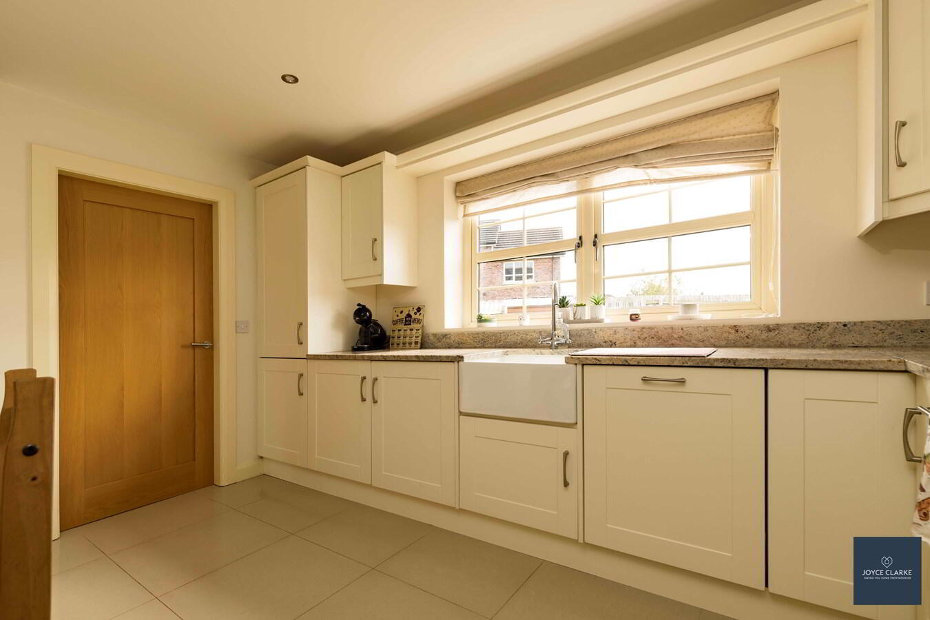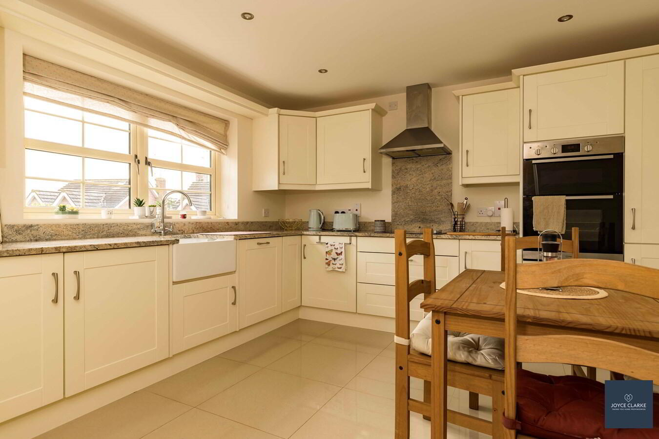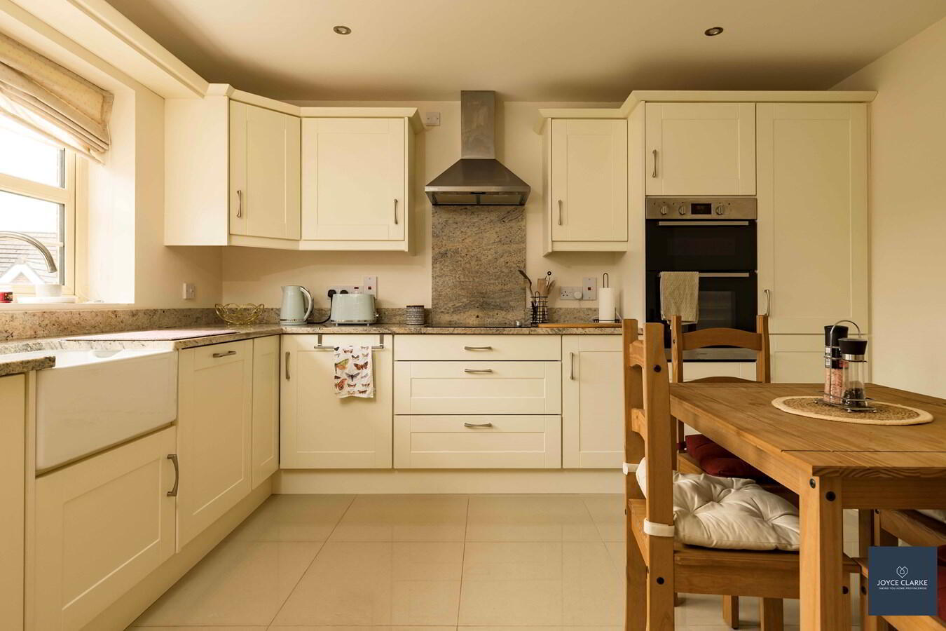 Cream country style kitchen with an excellent range of high and low level kitchen units with luxurious features, including a Belfast sink and granite worktop. Range of integrated kitchen appliances, including eye-level oven and grill, ceramic four ring hob, fridge-freezer, dishwasher and stainless steel extractor hood. Recessed lighting.